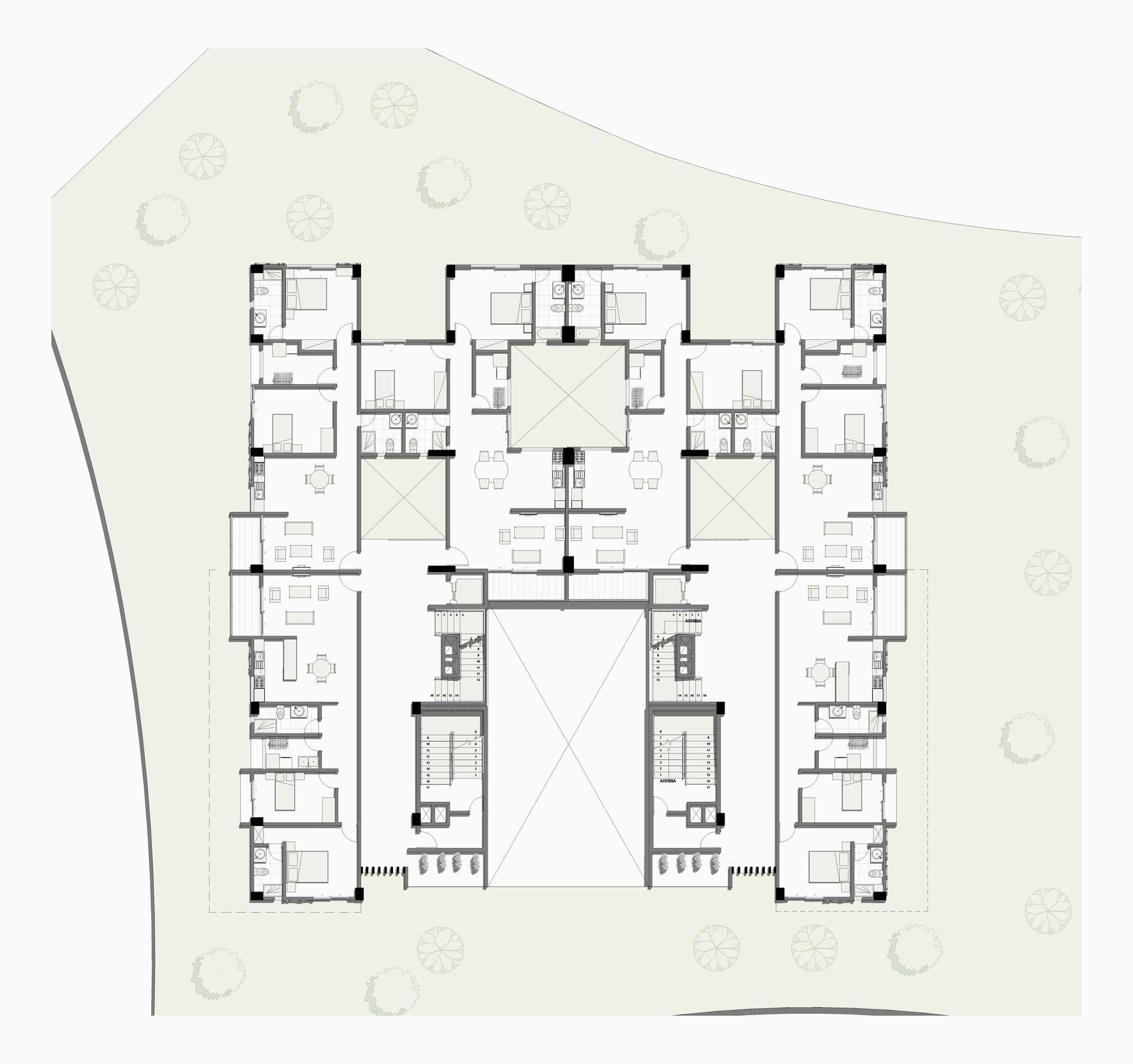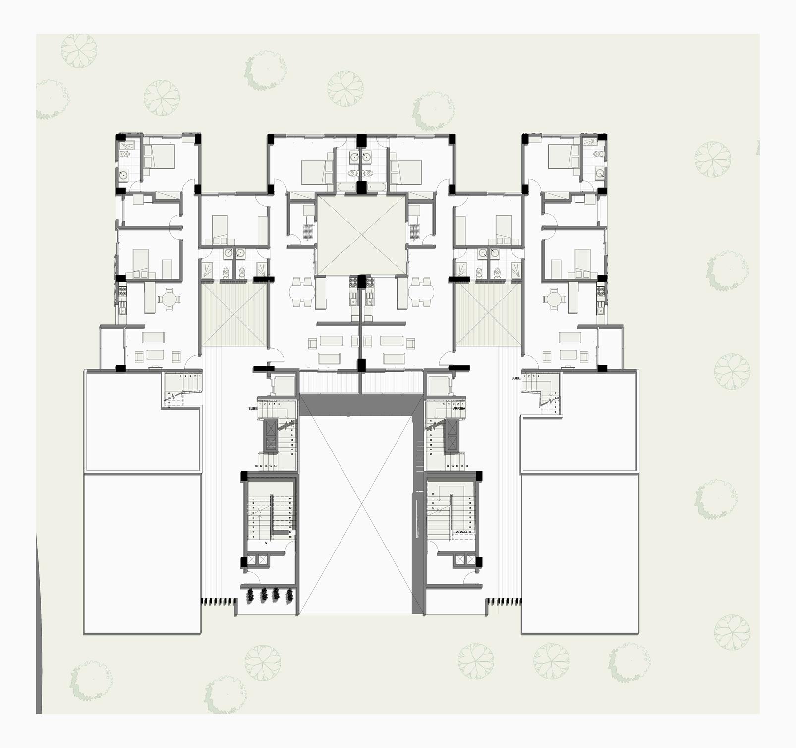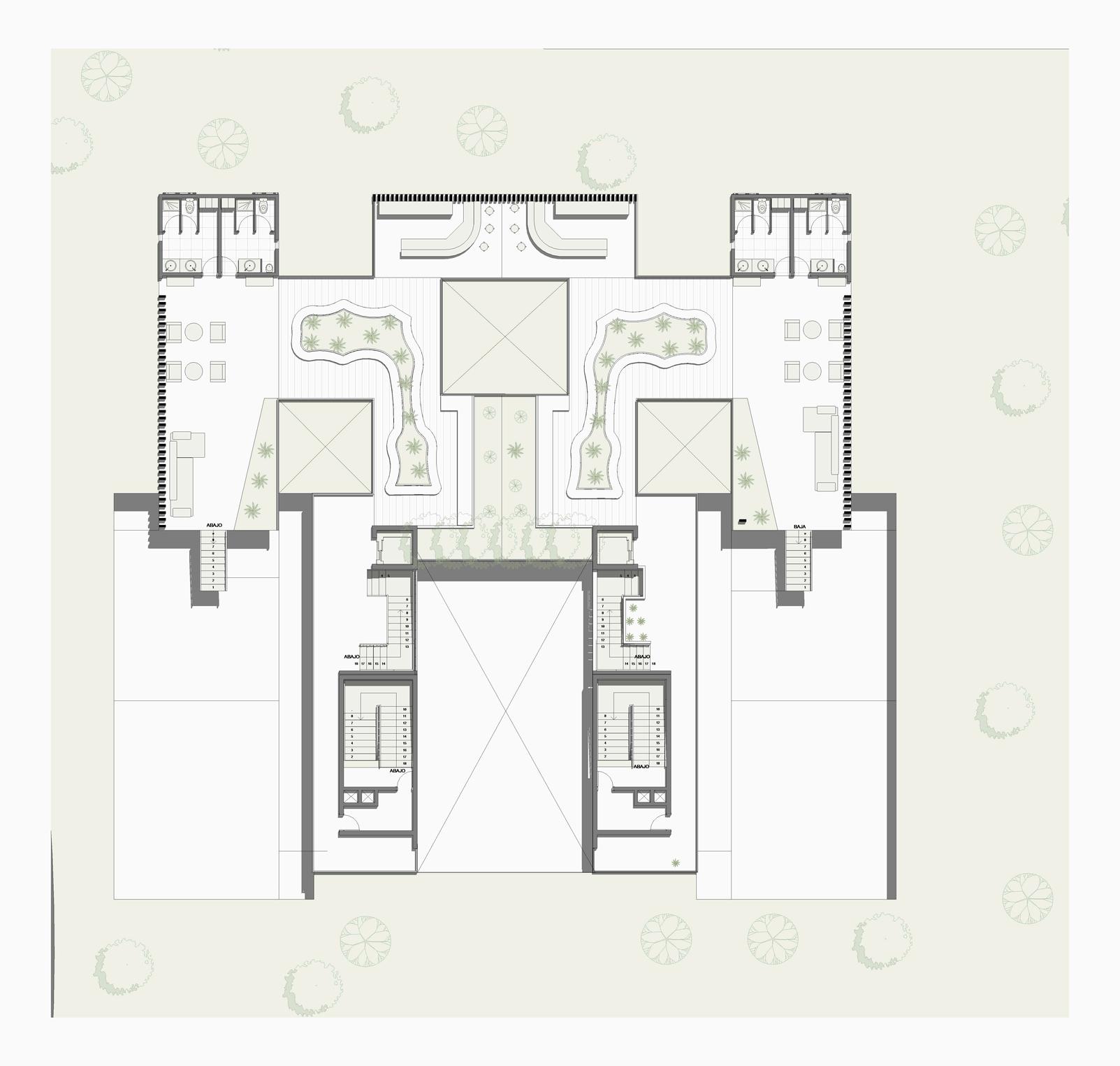 La abstracción de formas tipológicas utilizando simetría, jardines internos y terrazas con ritmo resulta en una propuesta arquitectónica que combina lo mejor de las tradiciones históricas con las necesidades y tecnologías contemporáneas. Este enfoque no solo enriquece la estética del edificio, sino que también mejora su funcionalidad y sostenibilidad, ofreciendo un entorno habitable que promueve el bienestar y la armonía