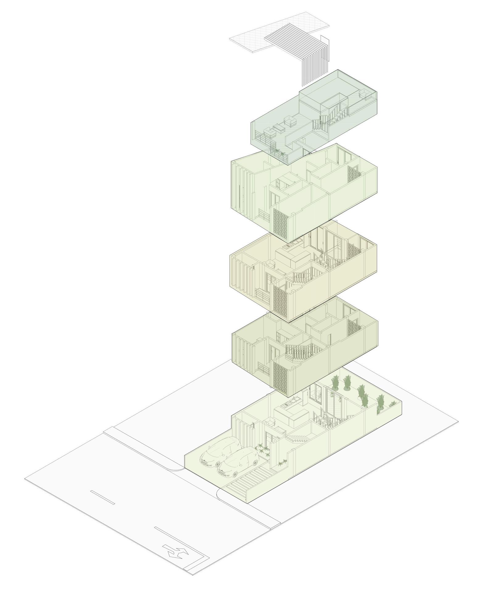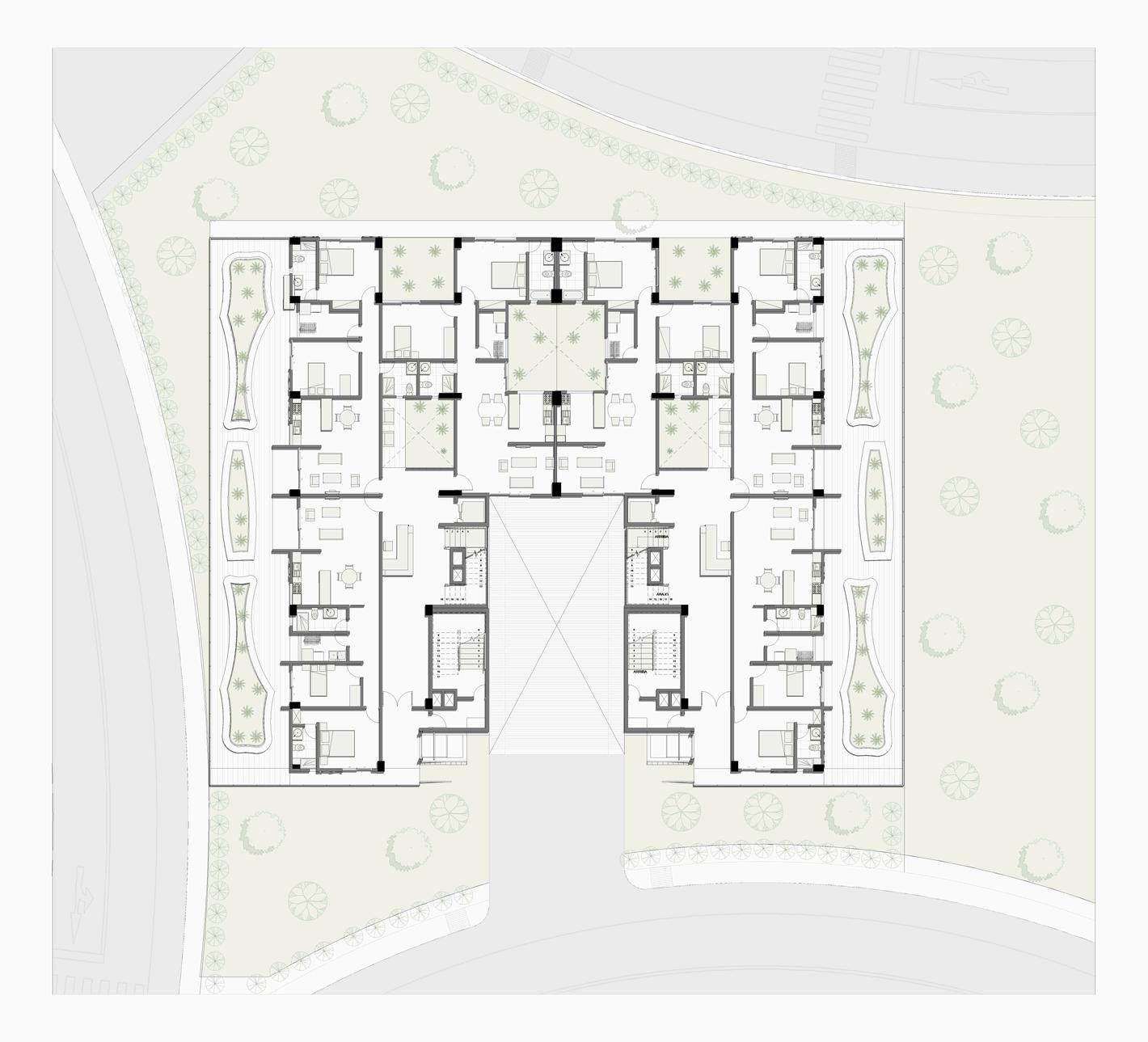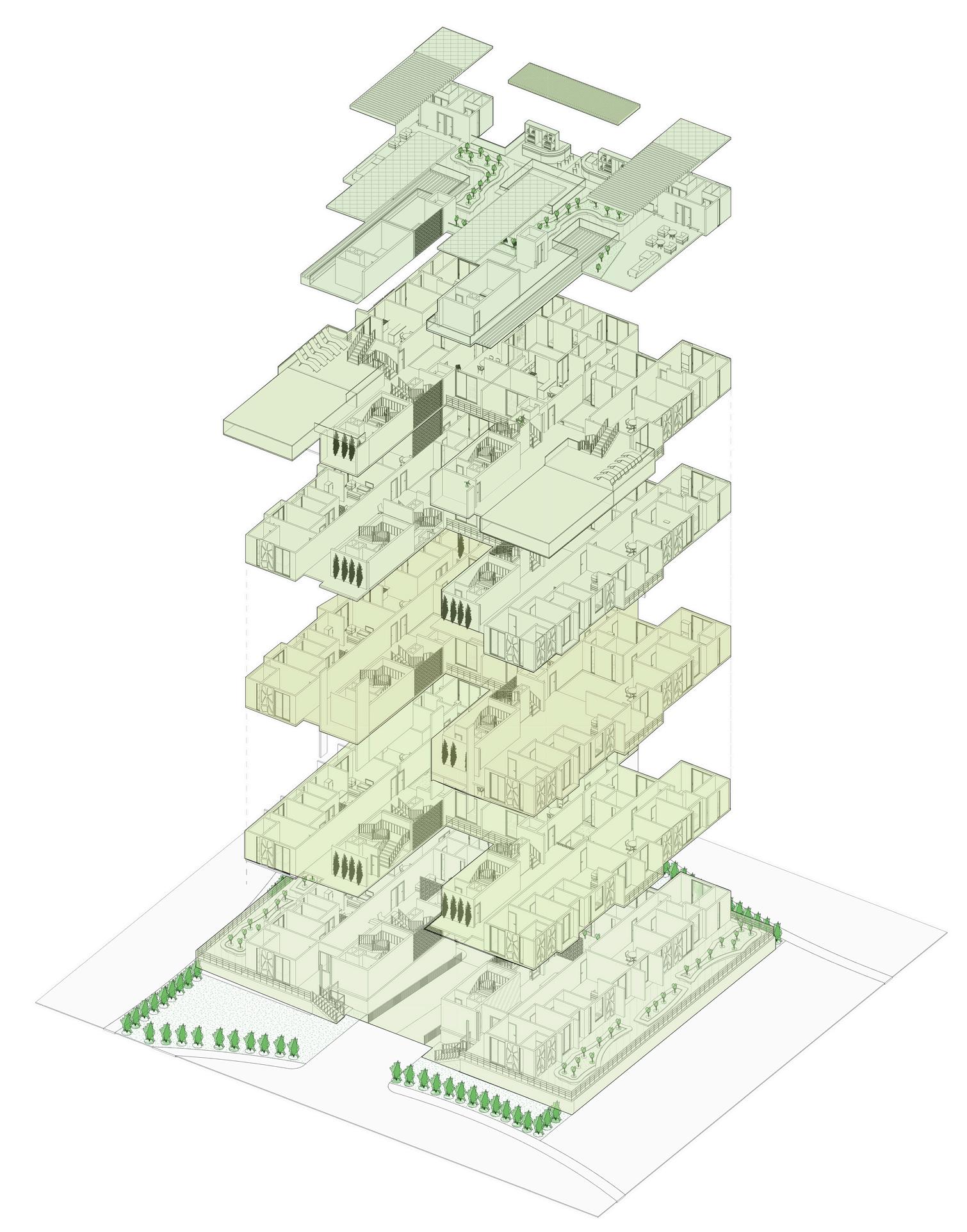 La abstracción de formas tipológicas utilizando simetría, jardines internos y terrazas con ritmo resulta en una propuesta arquitectónica que combina lo mejor de las tradiciones históricas con las necesidades y tecnologías contemporáneas. Este enfoque no solo enriquece la estética del edificio, sino que también mejora su funcionalidad y sostenibilidad, ofreciendo un entorno habitable que promueve el bienestar y la armonía