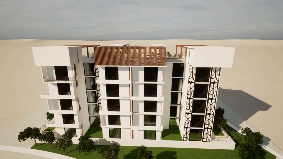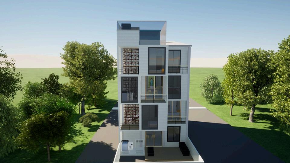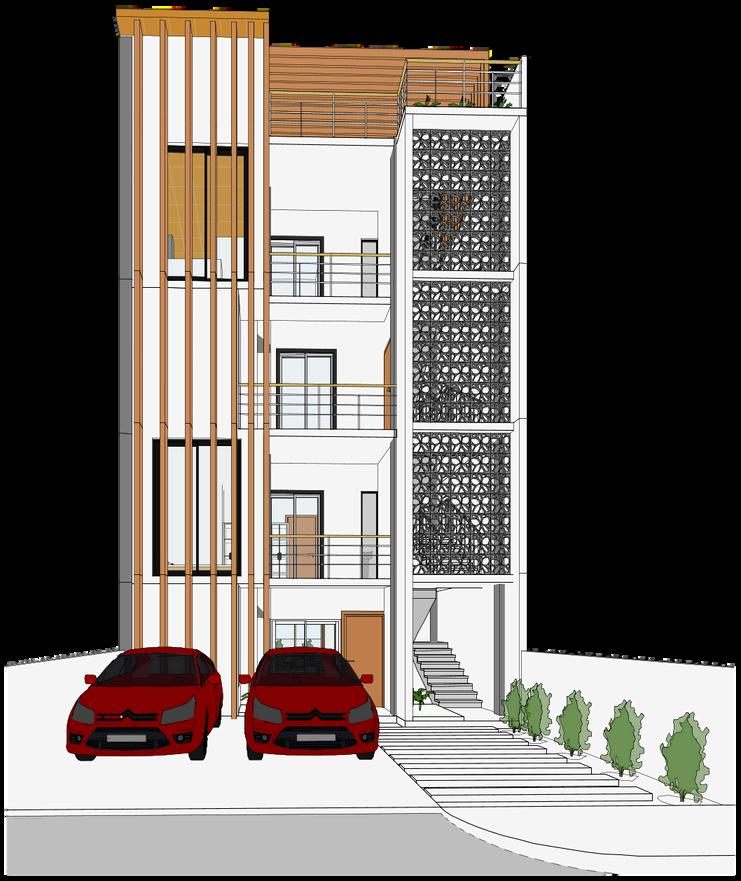 En esta vivienda se han diseñado 14 departamentos, distribuidos de la siguiente manera: tres en cada piso, excepto en el quinto piso, donde solo se encuentran dos Además, se ha incluido una piscina, y en el sexto piso se ha diseñado un roof garden que funcionará como una zona social.