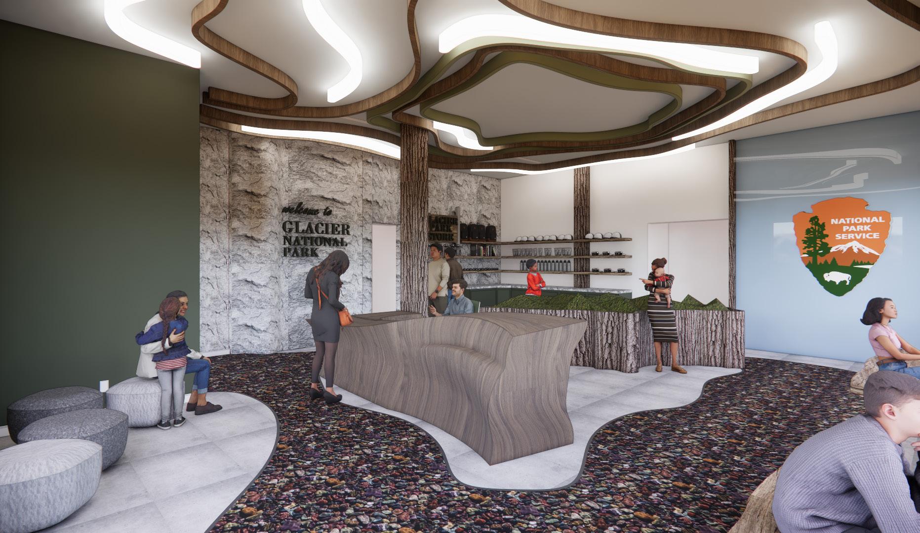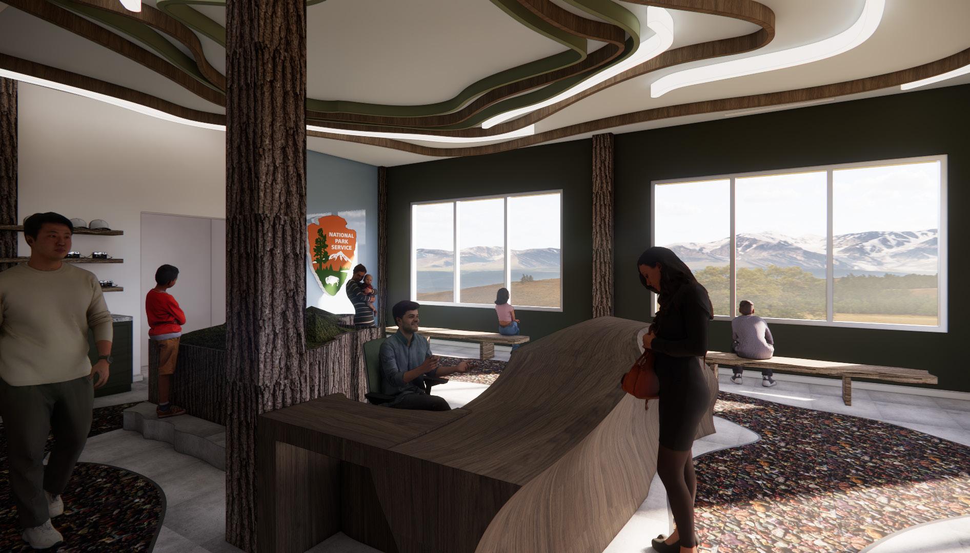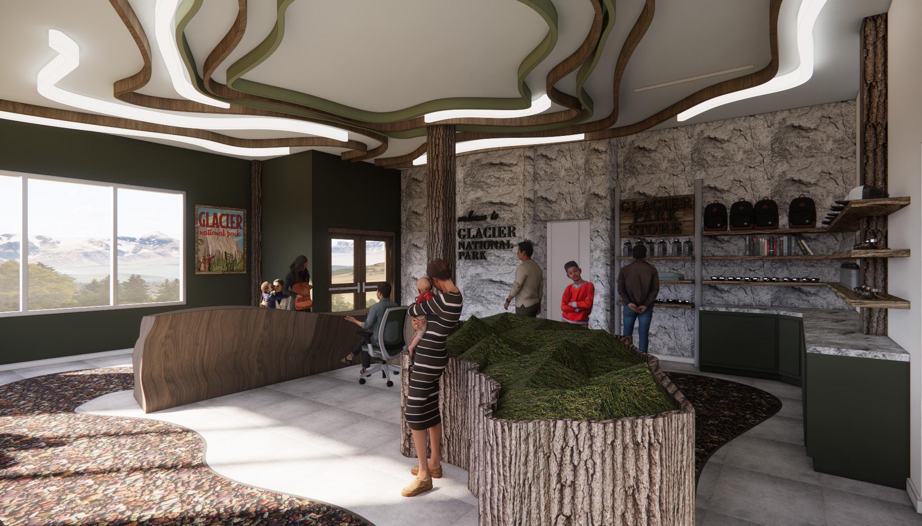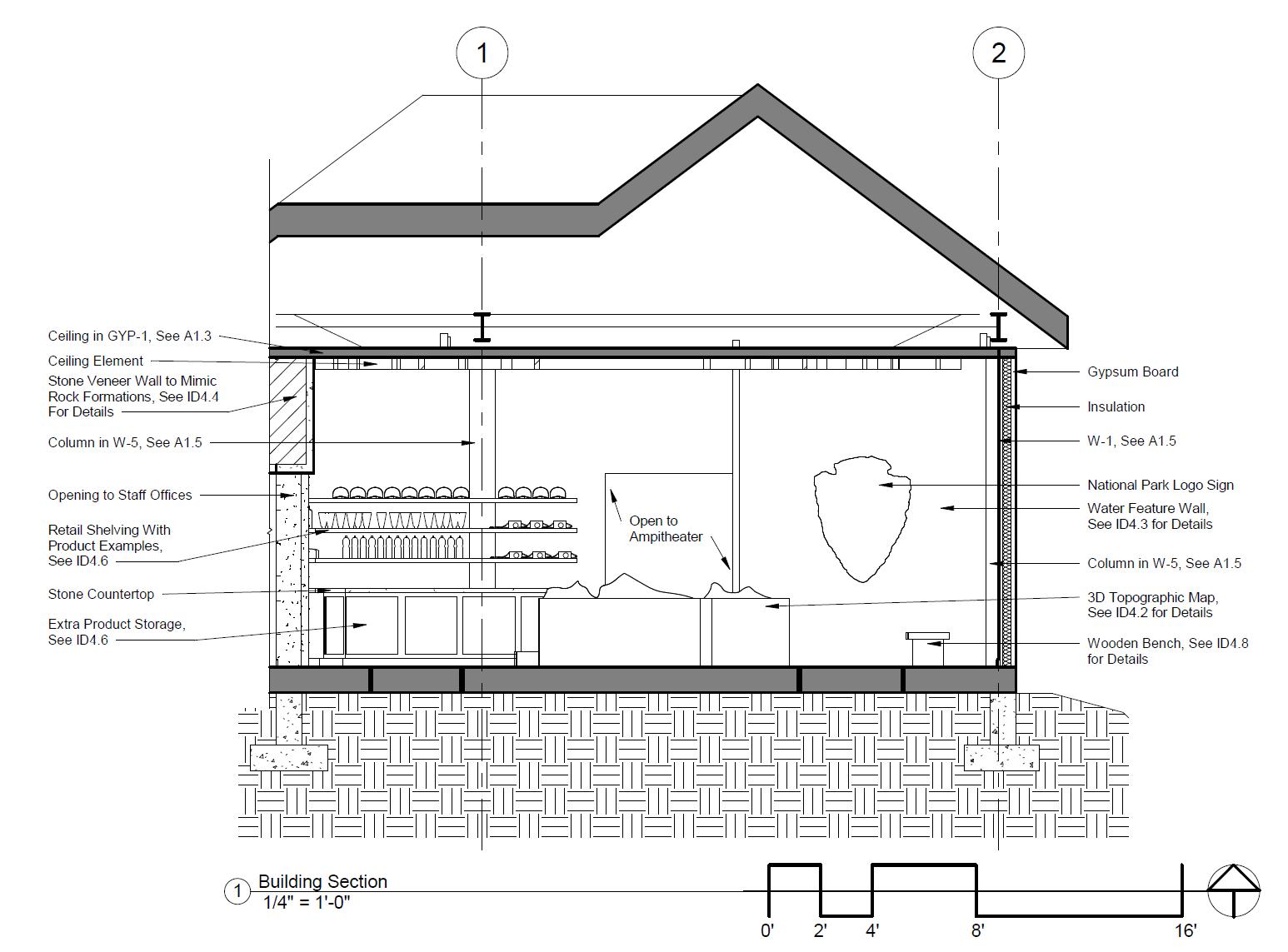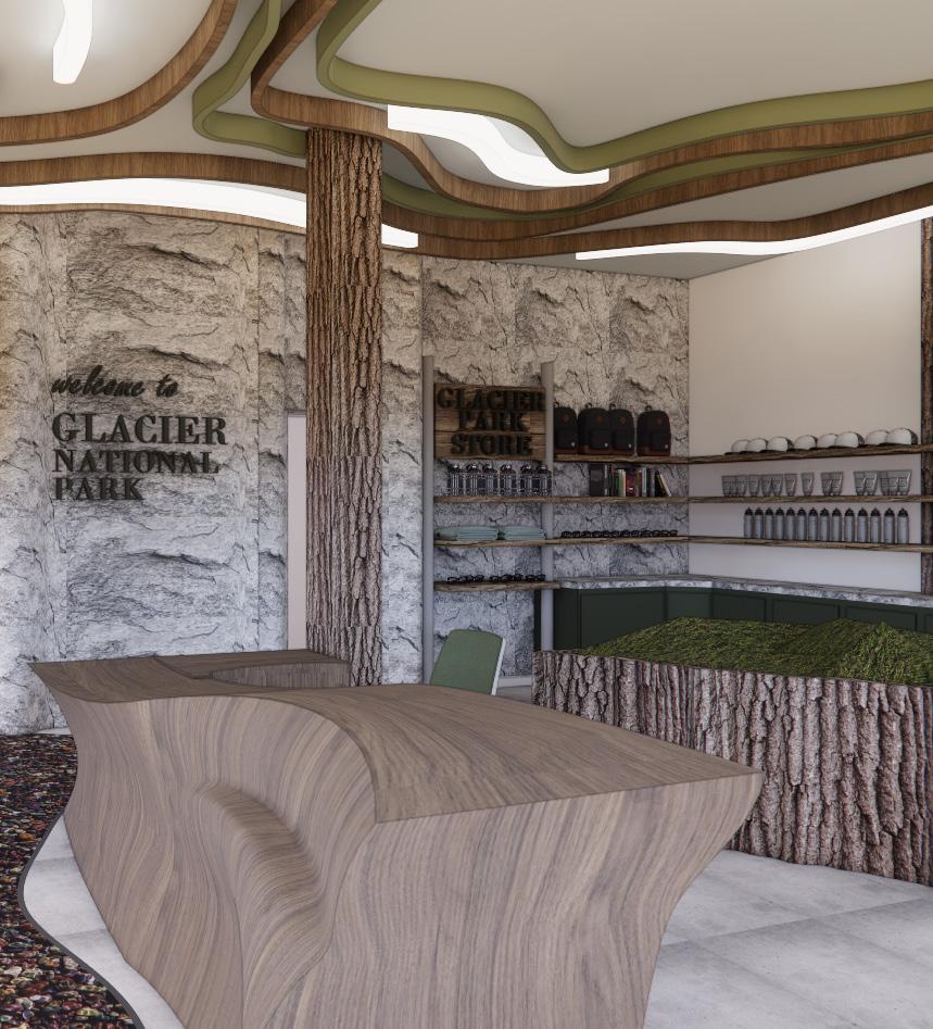In my second year I created a concept design for a visitor’s center in a location of choice on a long roll of trace paper. In my fourth year, I built the design in Revit, with some small changes. I then created a set of construction documents for the space. I chose Glacier National Park as my location and based my design on some distinct elements of the area and the nature around it. This involved a few custom elements that were detailed in my CD’s.