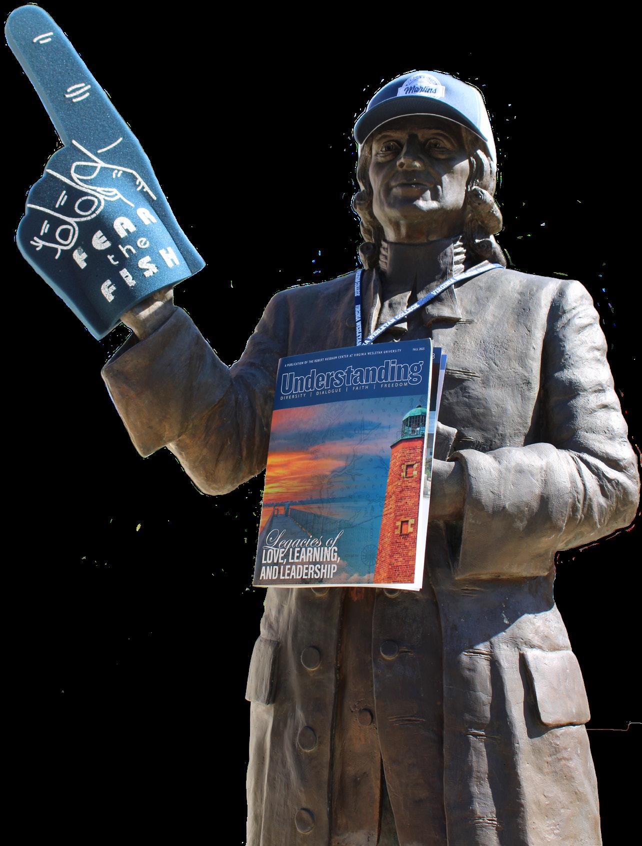 university promotes the Sacred Spaces Tour with Drs. Larry Hultgren and Stephen Mansfield on Hoco Weekend by decorating the John Wesley statue on campus.