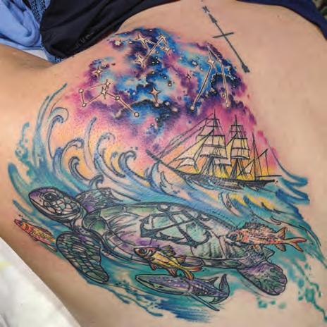 My sailing tat. Earned my shellback sailing on Gulden Leeuw in 2017 for Class Afloat. Constellations are what was above me as I crossed the equator. Three red squirrelfish for my official Court of Neptune induction (my nickname is Squirrel). Got to swim with a female whale shark at St. Helena, so that is Helena down at the bottom.