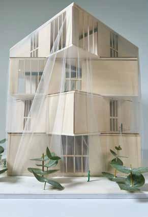 Drawings designed in Rhino and Illustrator. Model built using basswood, museum board, elastic mesh, and eucalyptus plants. (Spring 2024)