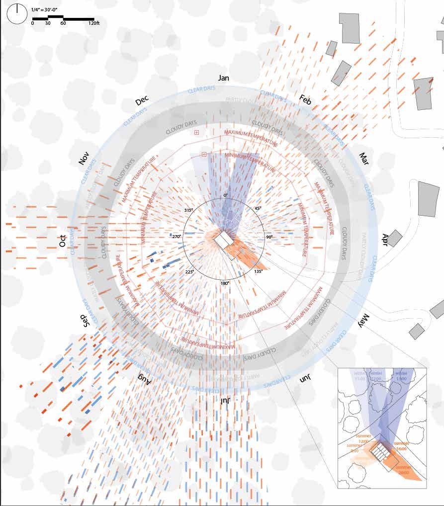 Sited amidst the Scandinavian forests of Trondheim, Norway, the proposed yoga studio experiences severe winters, cool summers, and no dry season. We were tasked with designing a building that could use many passive methods of heating and cooling along with standard mechanical systems. Colorcoded experimental models and drawings were completed to show temperature, wind direction, and sun exposure of this timber structure. Employing these systems taught me how passive methods can work together or against each other to produce a certain climatic result.