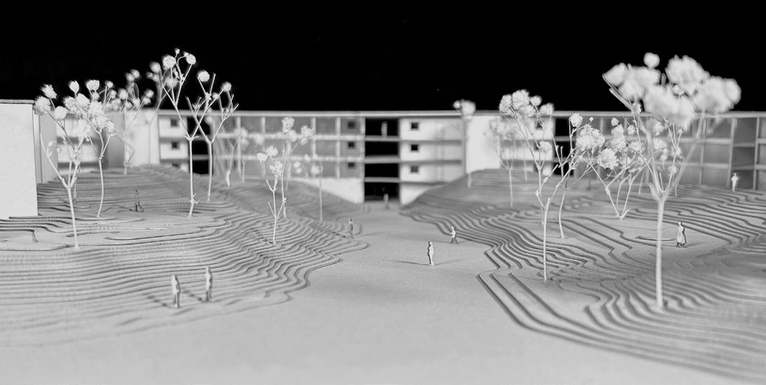 The Syracuse city proposal for replacing highway I-81 with a walkable boulevard prompted this design. The residential complex is designed for growing families; it contains 56 units and surrounds a community folly. Each unit has the opportunity to change and grow with the implementation of new walls and re-programming spaces. The folly in the middle acts as a community tree garden for residents and the greater public. It brings in native New York trees and shrubs to increase greenery in the city.