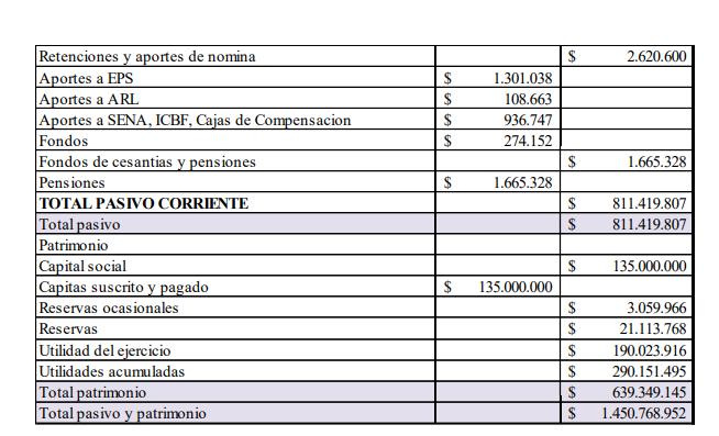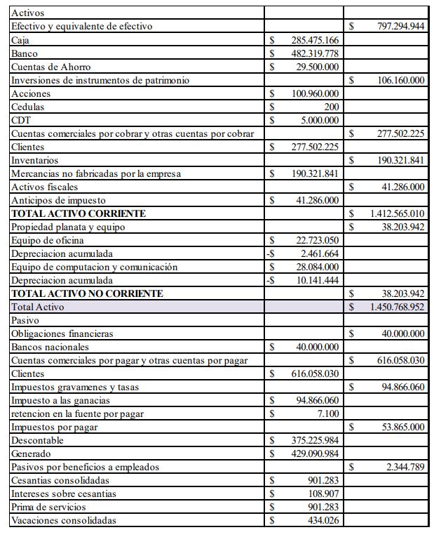 1509 EQUIPOS DE COMUNICACIÓN Y COMPUTACION 28.084.000 10.141.444 17.942.556 150901 Equipo procesamiento de datos 28.084.000 150998 Depreciacion acumulada 10.141.444 1801 ANTICIPO DE IMPUESTOS 41.286.000 0 41.286.000 180101 Retencion en la fuente 41.286.000 2101 BANCOS NACIONALES 10.000.000 50.000.000 40.000.000 210102 Pagarés 10.000.000 50.000.000 2201 NACIONALES 697.102.000 1.313.160.030 616.058.030 220101 Proveedores nacionales 697.102.000 1.313.160.030 2403 IMPUESTO A LAS GANANCIAS 94.858.960 94.858.960 240301 Vigencia fiscal corriente 94.858.960 2404 IMPUESTOS VENTAS POR PAGAR 375.225.984 429.090.984 53.865.000 240401 Descontable 375.225.984 240402 Generado 429.090.984 2422 RETENCION EN LA FUENTE POR PAGAR 15.855.535 15.862.635 7.100 242203 Honorarios 275.000 275.000 242205 Servicios 10.000 17.100 242206 Arrendamientos 105.000 105.000 242208 Compras 15.465.535 15.465.535 2502 CESANTIAS CONSOLIDADAS 901.283 901.283 250202 Ley 501990 901.283 2503 INTERESES sobre CESANTIAS 108.197 108.197 250301 Intereses sobre cesantías 108.197 2504 PRIMA DE SERVICIOS 901.283 901.283 240401 Prima de servicios 901.283 2505 VACACIONES CONSOLIDADAS 434.026 434.026 250501 Vacaciones consolidadas 434.026 2510 RETENCIONES Y APORTES DE NOMINA 2.620.600 2.620.600 251001 Aportes a EPS 1.301.038 251002 Aportes a ARL 108.663 251003 Aportes a ICBF. SENA. Cajas de Compensacion 936.747 251009 Fondos 274.152