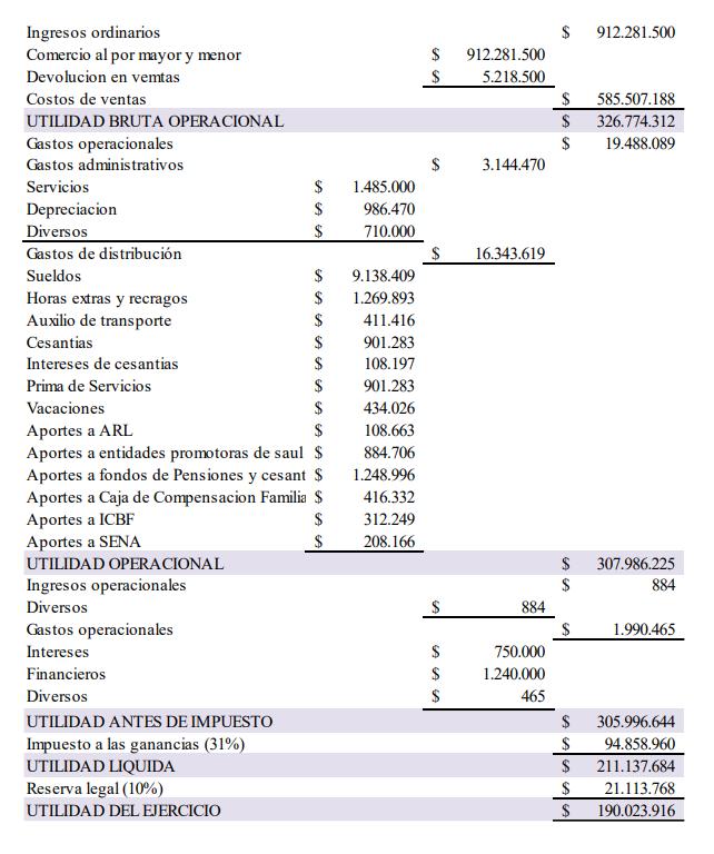 520102 Sueldos 9.138.409 520104 Horas extras y recargos 1.269.893 520108 Auxilio de transporte 411.416 520109 Cesantías 901.283 520110 Intereses / cesantías 108.197 520111 Prima de servicios 901.283 520112 vacaciones 434.026 520126 Aportes a ARL 108.663 520127 Aportes a Entidades promotoras de salud 884.706 520128 Aportes a fondos de pensiones y/o cesantías 1.248.996 520129 Aportes a cajas de compensación familiar 416.332 520130 Aportes a ICBF 312.249 520131 Aportes a SENA 208.166 5301 INTERESES 750.000 750.000 530101 Banco de Bogota 750.000 5305 Financieros 1.240.000 1.240.000 530505 Gastos Bancarios 850.000 530515 Comisiones 150.000 530595 Otros GMF 240.000 5395 DIVERSOS 465 465 539540 Otros Retencion en la fuente 465 6107 COSTO COMERCIO AL POR MAYOR Y POR MENOR 585.507.186 585.507.186 610718 Venta de electrodomesticos y muebles 585.507.186