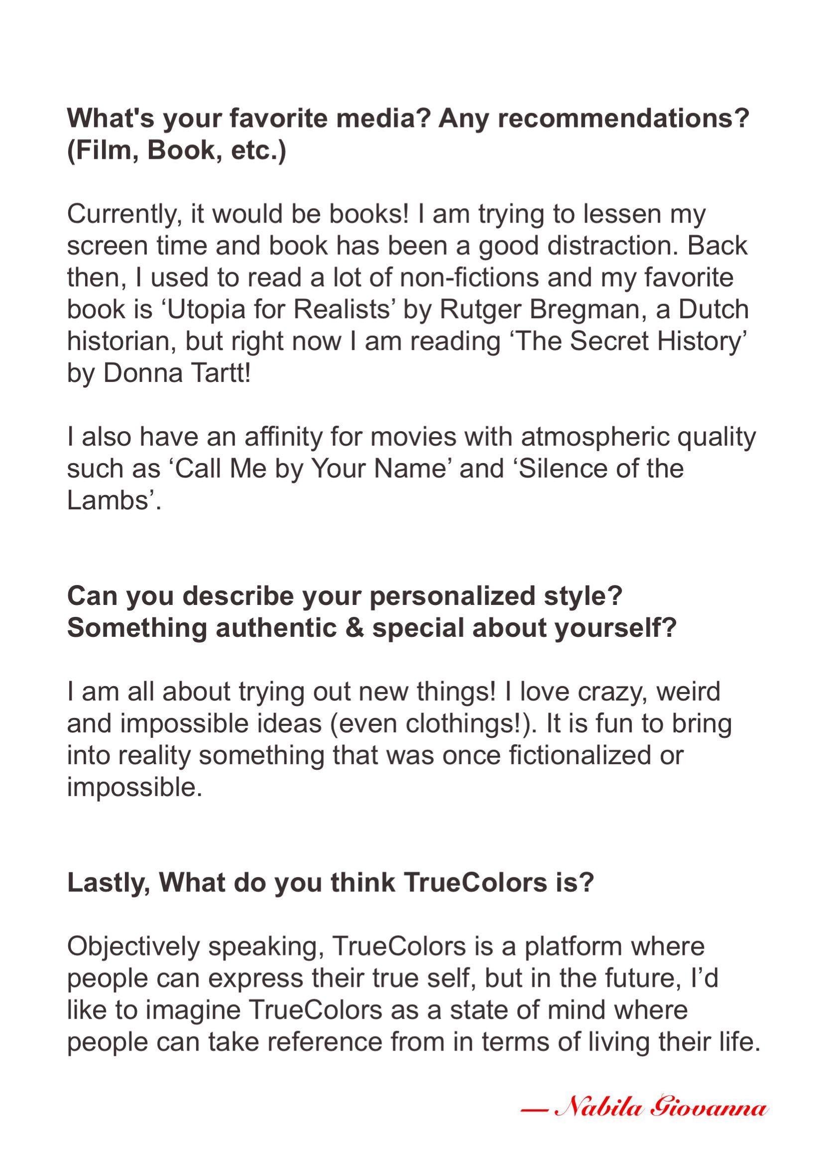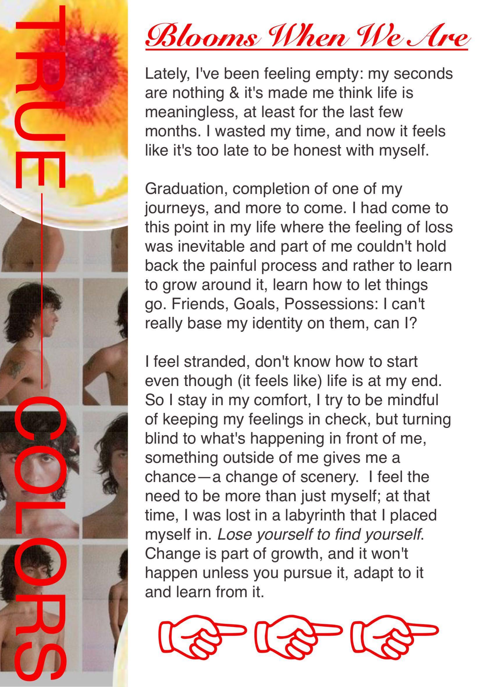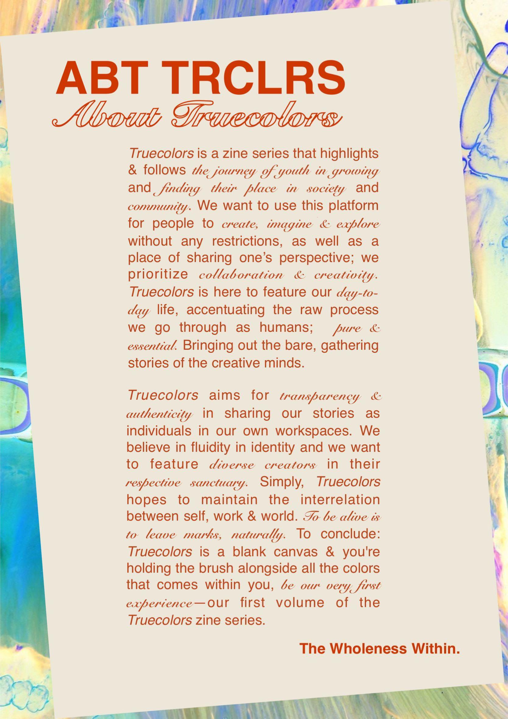 (Cut Version) TrueColors is a zine series that highlights & follows the journey of youth in growing and finding their place in society and community. In the first volume ‘Blooms When We Are’, we focused the theme on self-development, emotions & growth. While also using flowers as symbols to a much deeper mechanism & analogy to our distinctively creative process. We want to let our participants freely express & implement their ideas in our zine series by giving them a platform to do so; a look into the daily life & progress of The TrueColors.