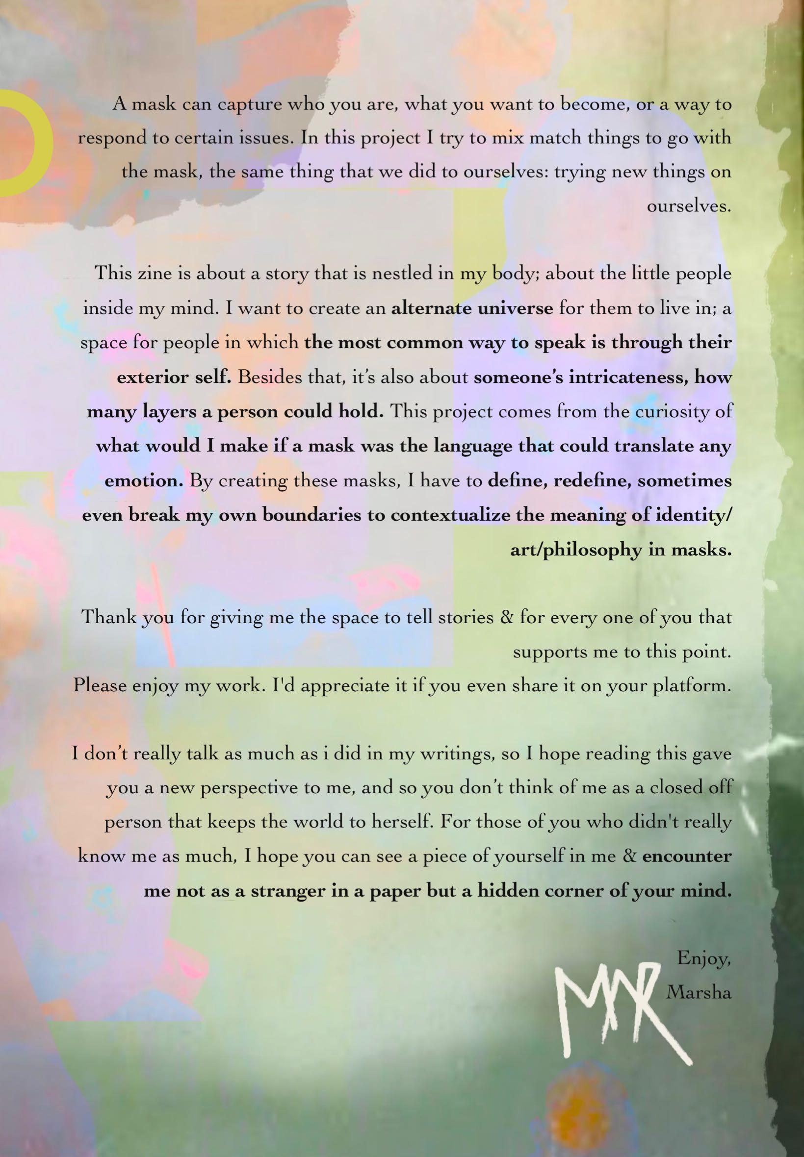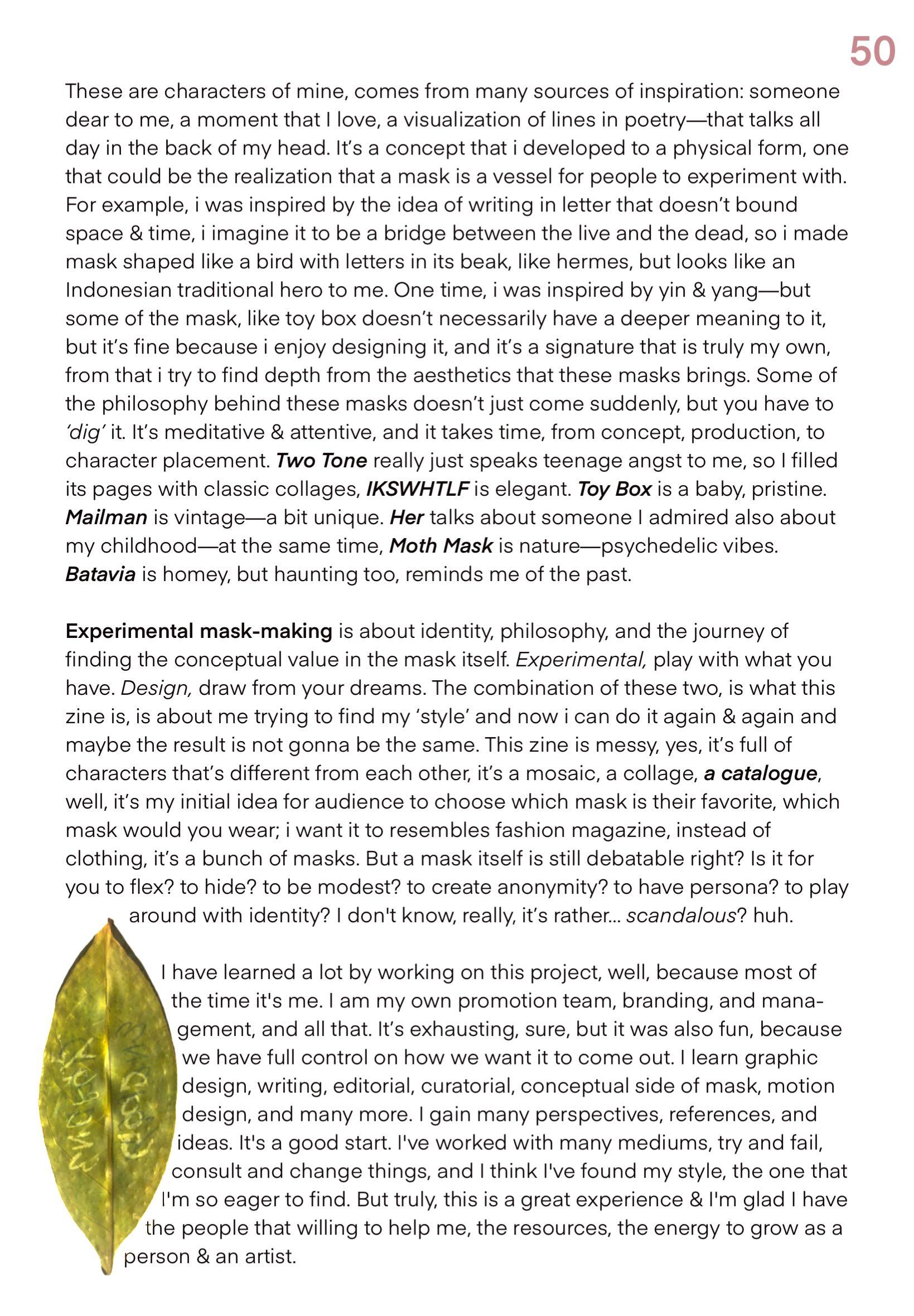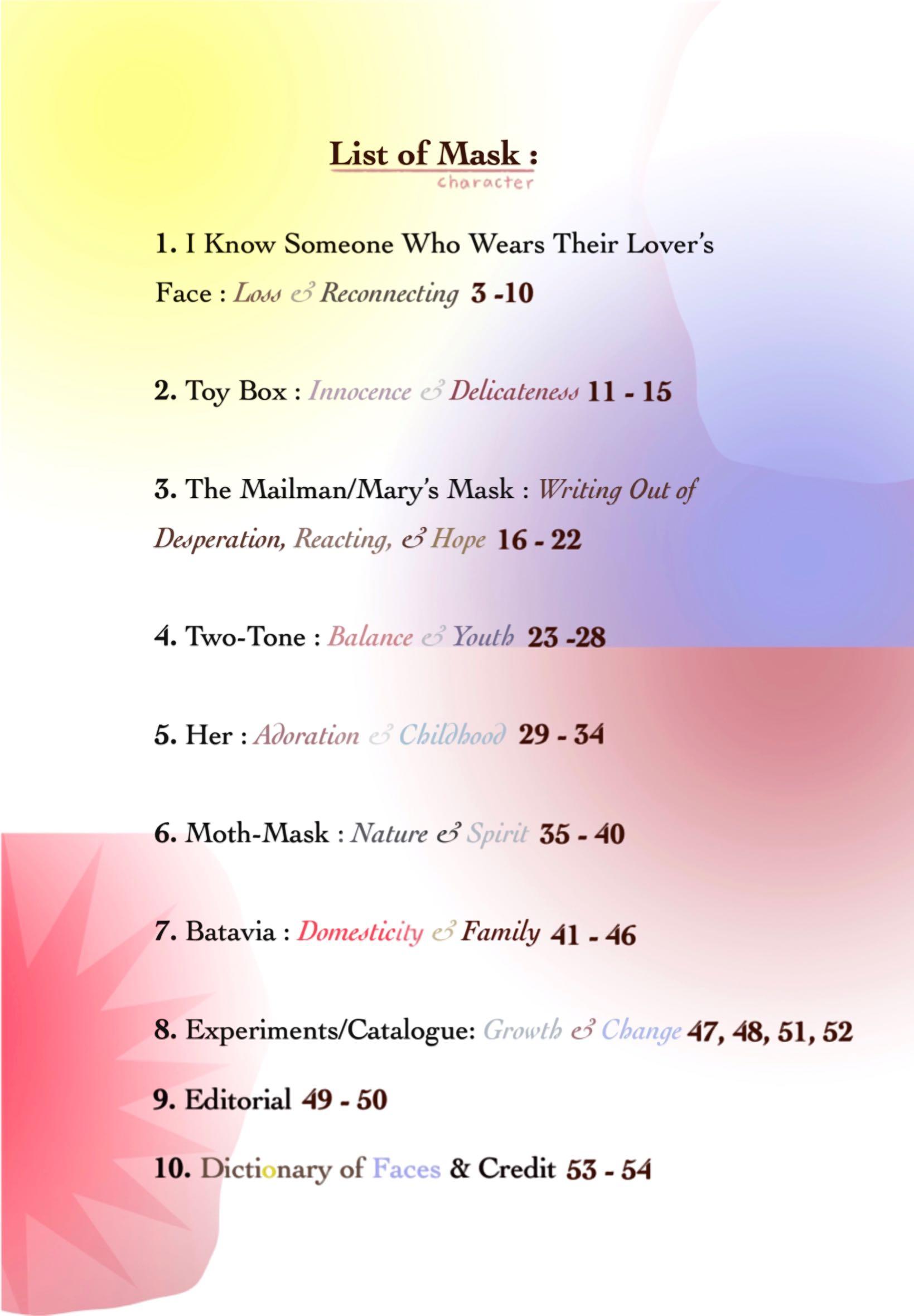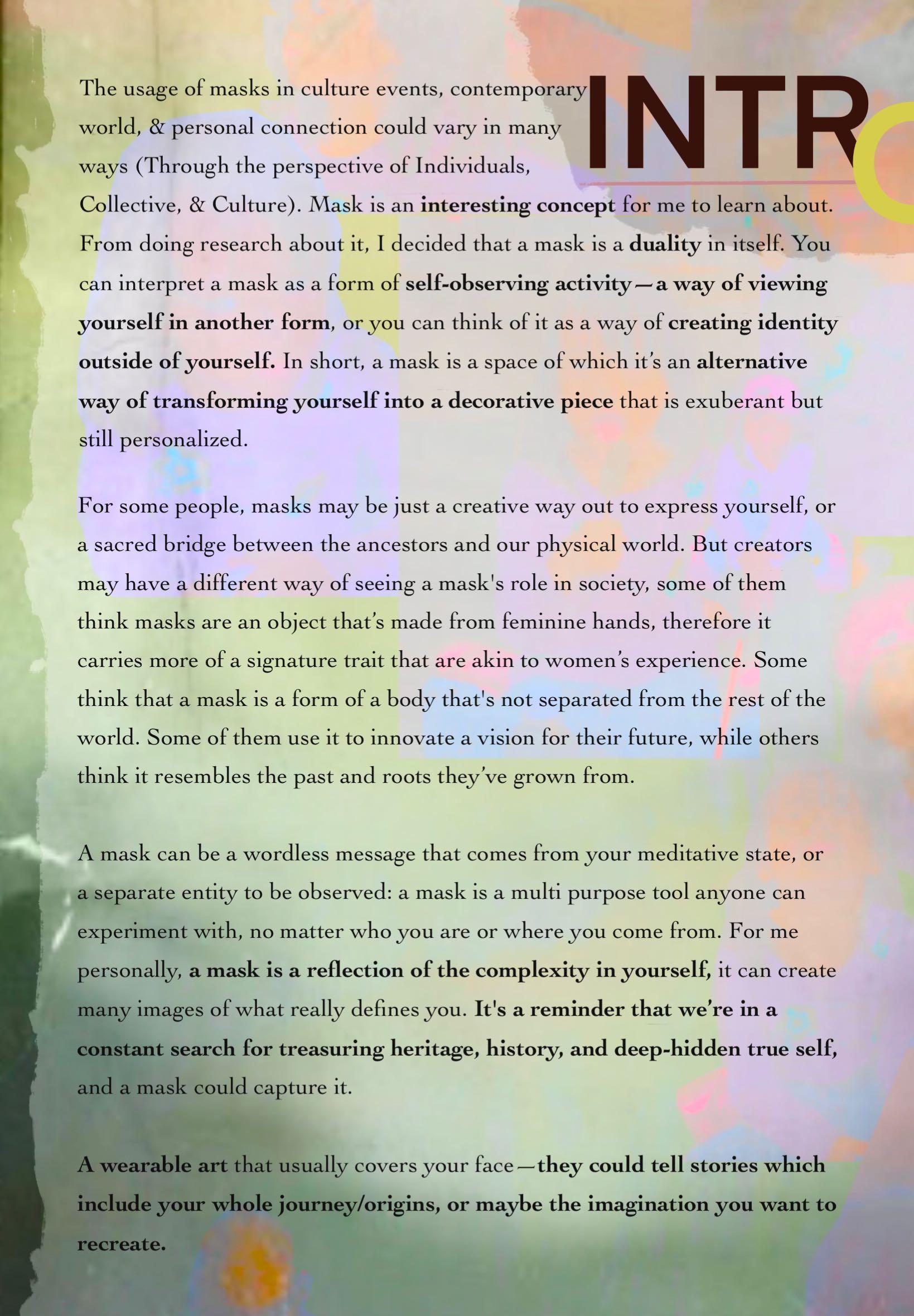 Dictionary of Faces is a series of masks gathered together in one catalog creating mosaics that’s filled with diversity in colors, shapes, & stories. In this scene masks are analyzed & used as a way of recreating oneself. Relating it with identity issues, fashion statements, & cultural values. Reforming this multi-purposes medium to be used as a form of storytelling & a vessel to decorate and play around with. (Art Concept by Marsha Ayu)