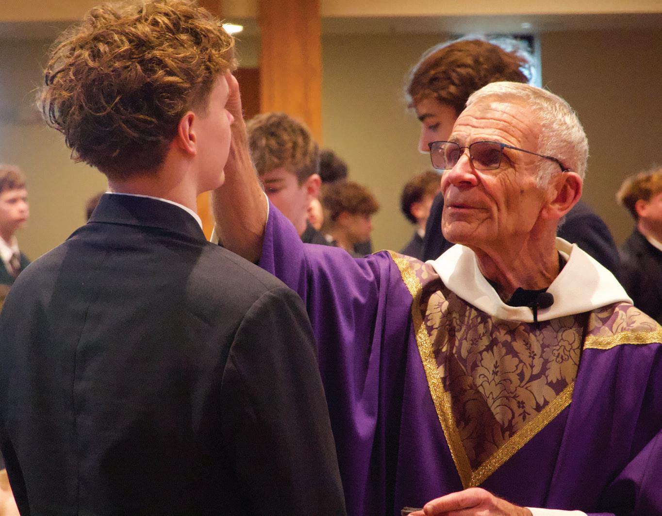 Pictured: Caden Anderson ’25 receives ashes from Abbot Joel Rippinger, OSB at the Ash Wednesday All-School Mass.