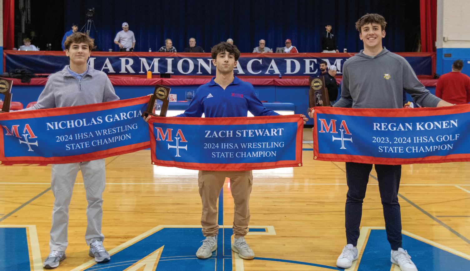 Marmion Wrestling Team wins 2025 IHSA Class 3A State Championship (pg. 15; photo by VIP Photography); Marmion prepares to welcome female students beginning with the 2026-2027 academic year. Information included within the Academy President’s message on this page.(Stock photo provided by Maclyn Marketing Agency)