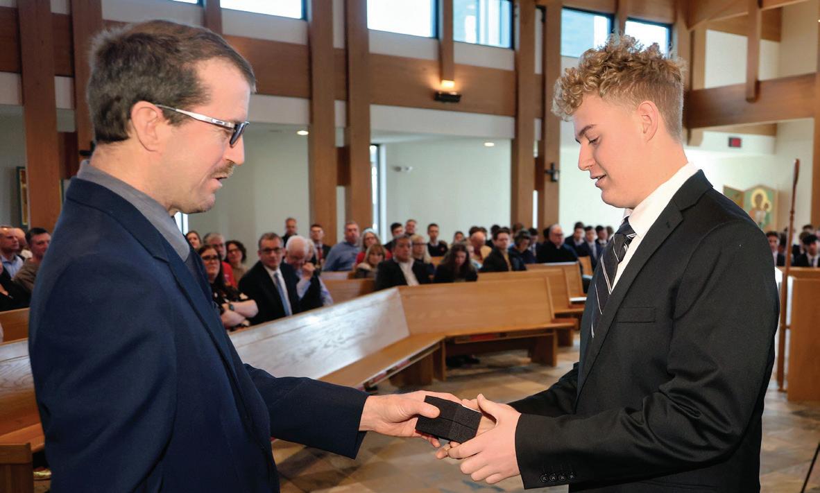 On February 23, 2025 Marmion Academy honored the Class of 2026 at the Junior Class Pin & Ring Ceremony. This annual ceremony celebrates the junior students as they take one step closer to becoming the new leaders of the school. All juniors who attended the ceremony were individually recognized and presented with a Class of 2026 lapel pin featuring the Marmion Academy crest, along with their class ring (if one was purchased). Legacy families were encourage to invite alumni family members to assist with the pin/ring presentation.