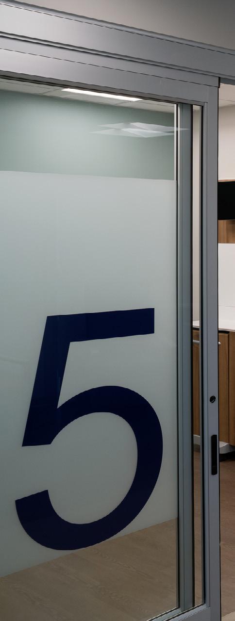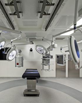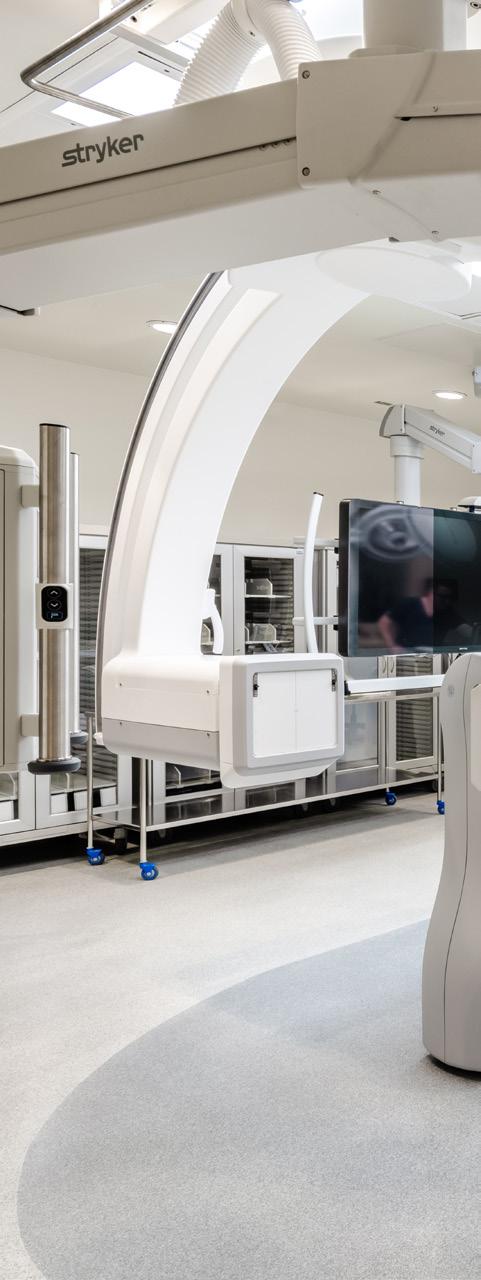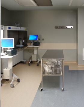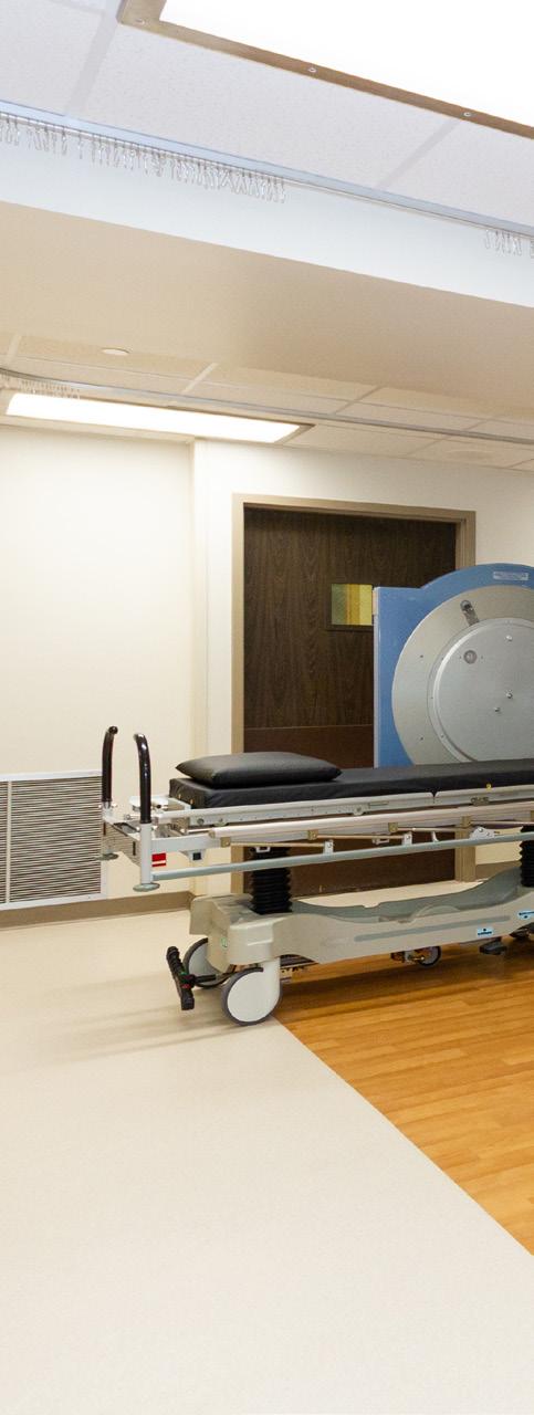 OR 22 is one of two operating rooms that share a single, moving intraoperative MRI, also known as an IMRIS. The IMRIS allows surgeons to obtain diagnosticquality images of the patient during surgeries. This hybrid OR/imaging room required magnetic shielding, thoughtful installation of nonferrous materials, and careful consideration on how to maintain a sterile environment. When fully functional, the IMRIS will be able to transverse both ORs via a ceiling track. This is one of a handful of Integrated MRIs in San Antonio and is able to accommodate the most complex of cases in the region.