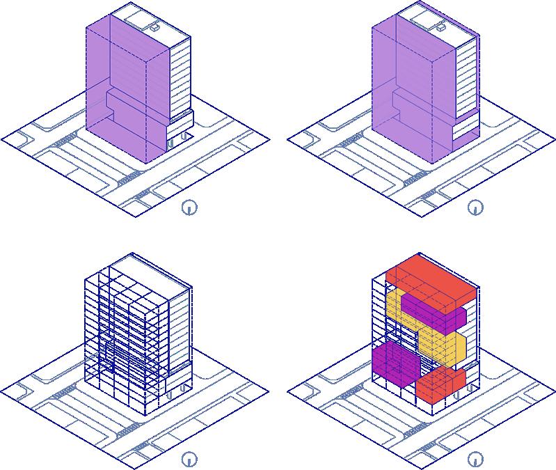 As circulações e espaços de serviços foram concentradas em dois blocos estruturais de concreto que cortam o edifício verticalmente, e trazem uma nova linguagem para as fachadas. É possível visualizar estes blocos no diagrama acima.