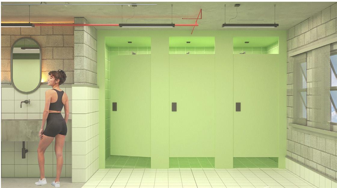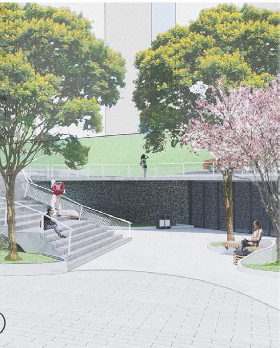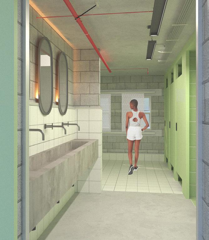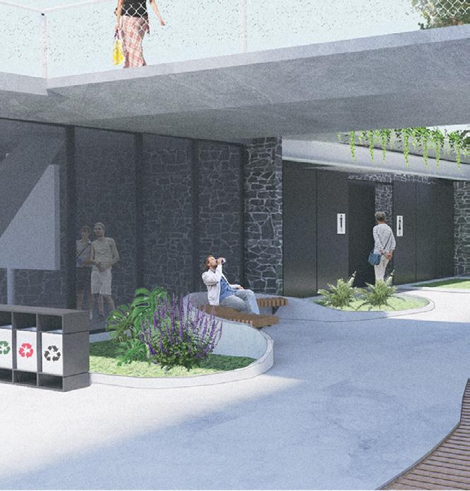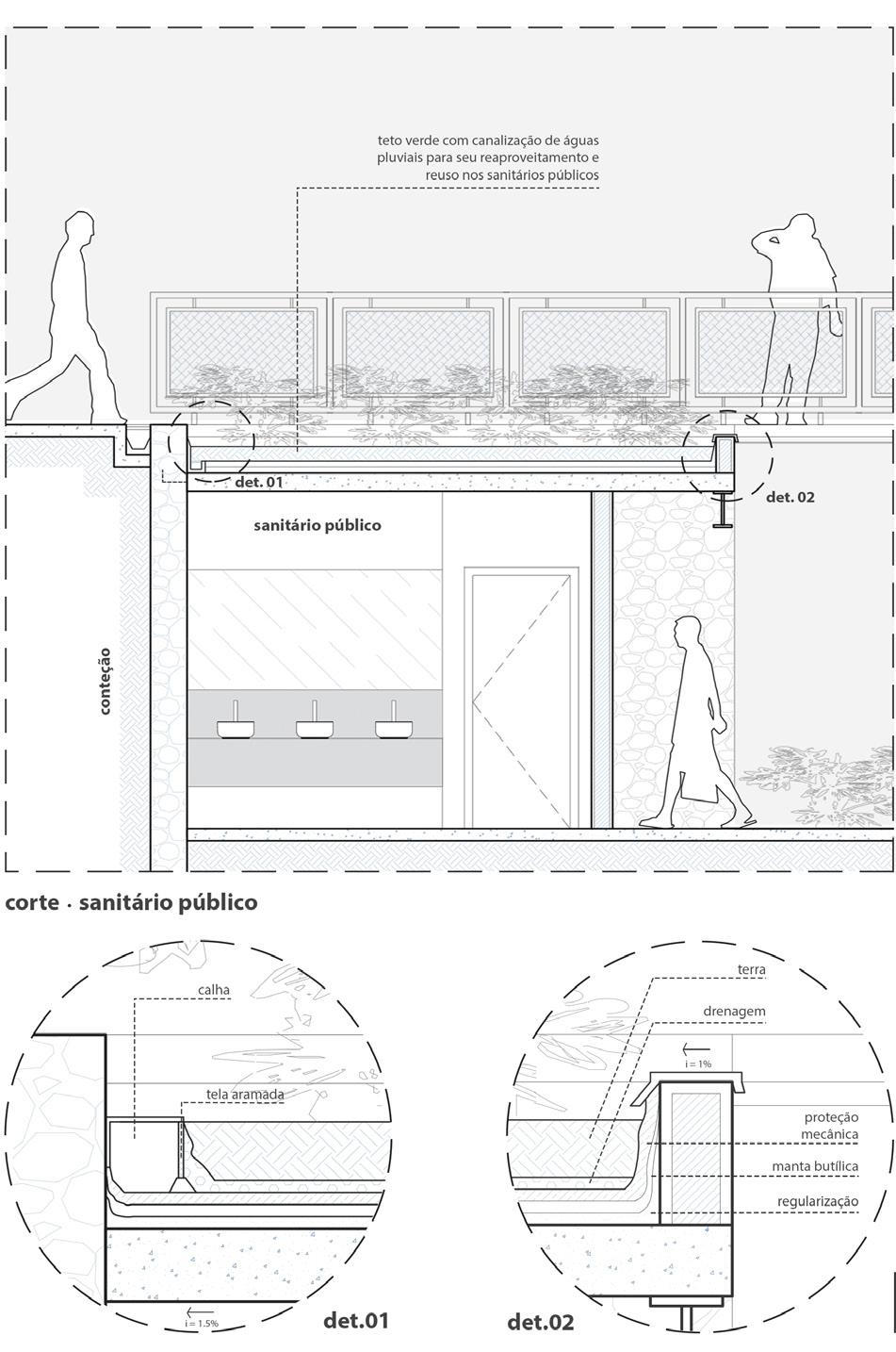 O projeto desenvolvido propõe um pátio com oferta de serviços, áreas livres e arborizadas, além de um banheiro público para atender as demandas do usuários. Os sanitários foram detalhados de modo a ter em suas coberturas um sistema de aproveitamento de água da chuva por meio de um teto verde, no intuito de reduzir o consumo de água destinados a descargas.