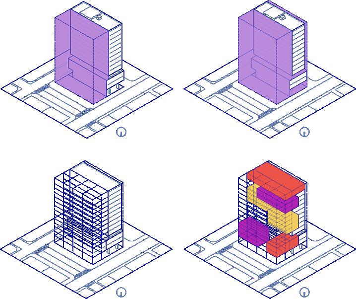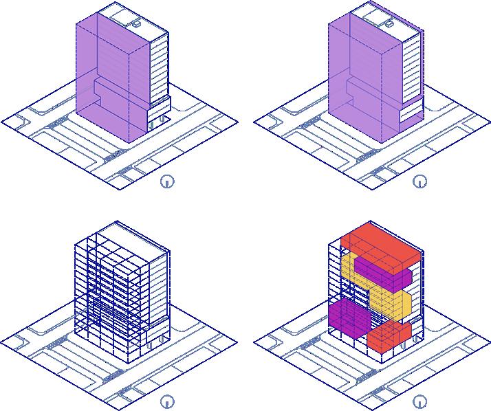 Tendo em vista a atual inadequação normativa da circulação existente do edifício, o desenho do projeto se inicia com a alocação de novos blocos de circulação.