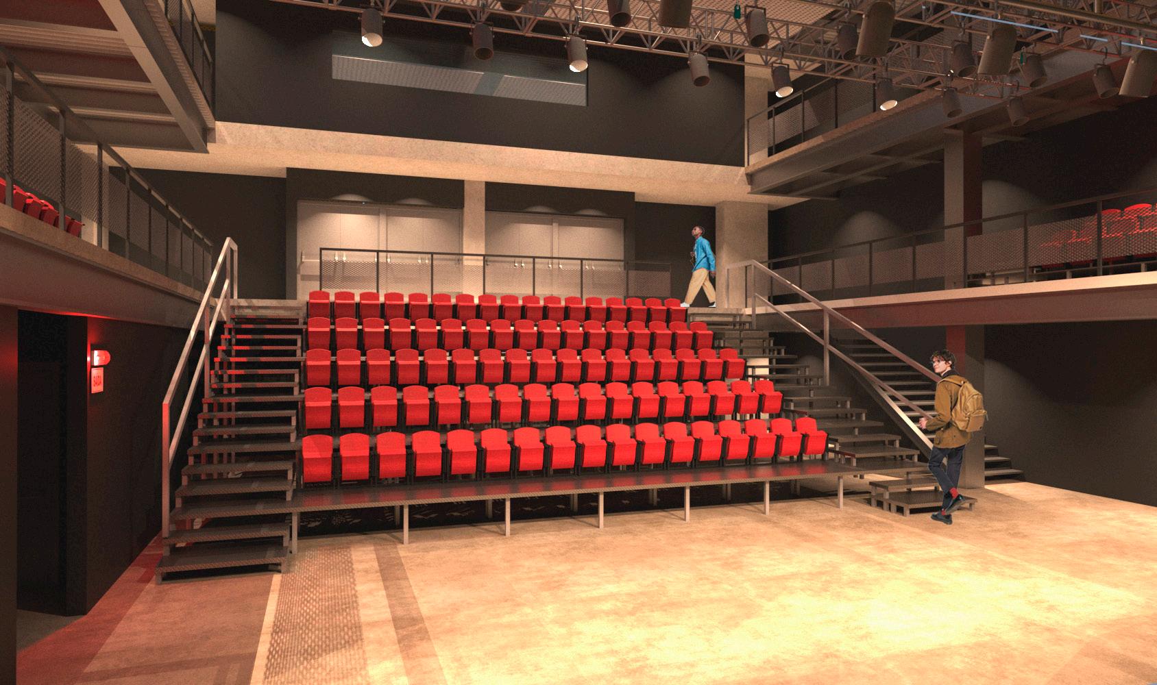 O nível de acesso da plateia ao auditório é pelo 5° pavimento, havendo um espaço disponibilizado para o foyer. Em caso de desmontagem da arquibancada, há uma escada permanente dentro do auditório que conecta do 4° com o 5° pavimento.