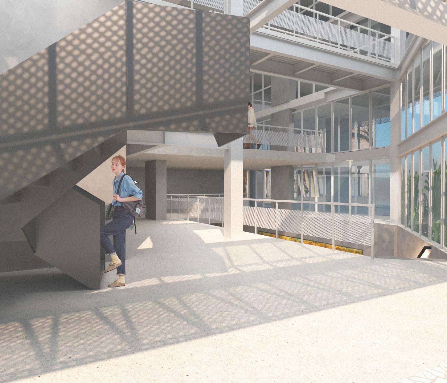 Para permitir mais conexões entre os pavimentos e, portanto, entre os diferentes usos, serão realizados cortes pontuais nas lajes de concreto existentes em alguns pavimentos na área de circulação da nova proposta.