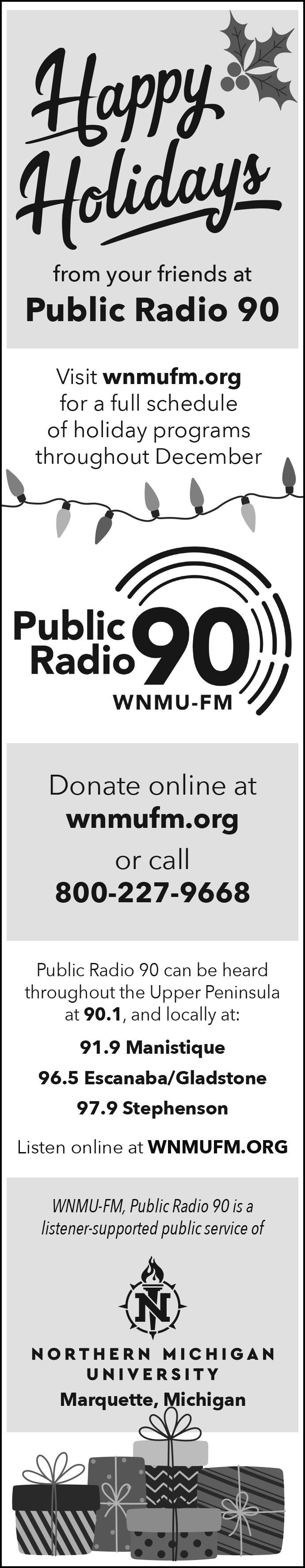 • Operation Great Christmas Free Community Dinner. Join other community members for a free Christmas meal of ham, turkey and sides. Register for delivery by Dec. 23. 11 a.m. to 2 p.m. The Up North Lodge Event Center, 215 S. CR-557. 906-360-7069.