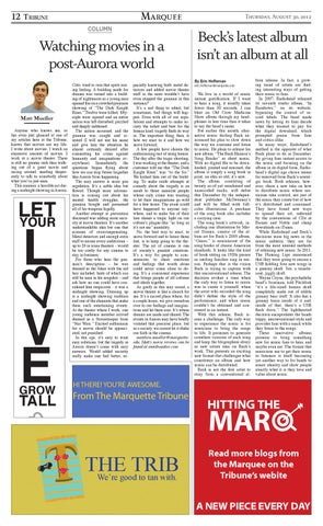 pecially knowing both metal detectors and added movie theater staff in the seats wouldn’t have even stopped the gunman in this instance? It’s a sad thing to admit, but sometimes, bad things will happen. Even with all of our regulations and attempts to make society the safest and best for the human kind, tragedy finds its way in. The important thing, then, is how we react to it and how we move forward. A few people have chosen the embarrassing tact of using humor. The day after the tragic shooting, I was working at the theater, and a customer told me that “The Dark Knight Rises” was “to die for.” We kicked him out of the building. To make snide attempts at comedy about the tragedy is an insult to those innocent people whose only crime was wanting to let their imaginations go wild for a few hours. The event could have happened to anyone anywhere, and to make fun of their loss shines a tragic light on our culture’s plague-like “as long as it’s not me” mentality. No, the best way to react, to move forward and to honor those lost, is to keep going to the theater. The art of cinema is one of society’s greatest creations. It’s a way for people to communicate, to share emotions and feelings that words alone could never come close to doing. It’s a communal experience that brings people of all cultures and ideals together. As goofy as this may sound, a movie theater is like a church for me. It’s a sacred place where, for a couple hours, we give ourselves over to our feelings and imaginations and let them soar. It’s where dreams are made and shared. The events in Aurora may have briefly violated that precious place, but as a society, we cannot let it shake our faith in the cinema. matthew.mueller@marquette. edu, Matt’s movie reviews can be found at onmilwaukee.com