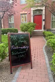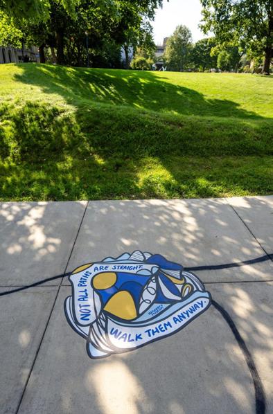 Titled “Walk the Line,” the display contains pieces from the exhibit graphic, with black chalk lines drawn out from the center of the piece and down the sidewalks.