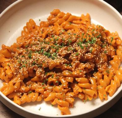Take this creamy chili oil pasta, for instance. If you fry tomato paste, shallots and garlic in this oil and blend it with heavy cream, you get a smooth, luxuriously rich sauce to coat your favorite pasta. The result is a dish that resembles a classic vodka sauce, just spicier, more savory and overall, more delicious.