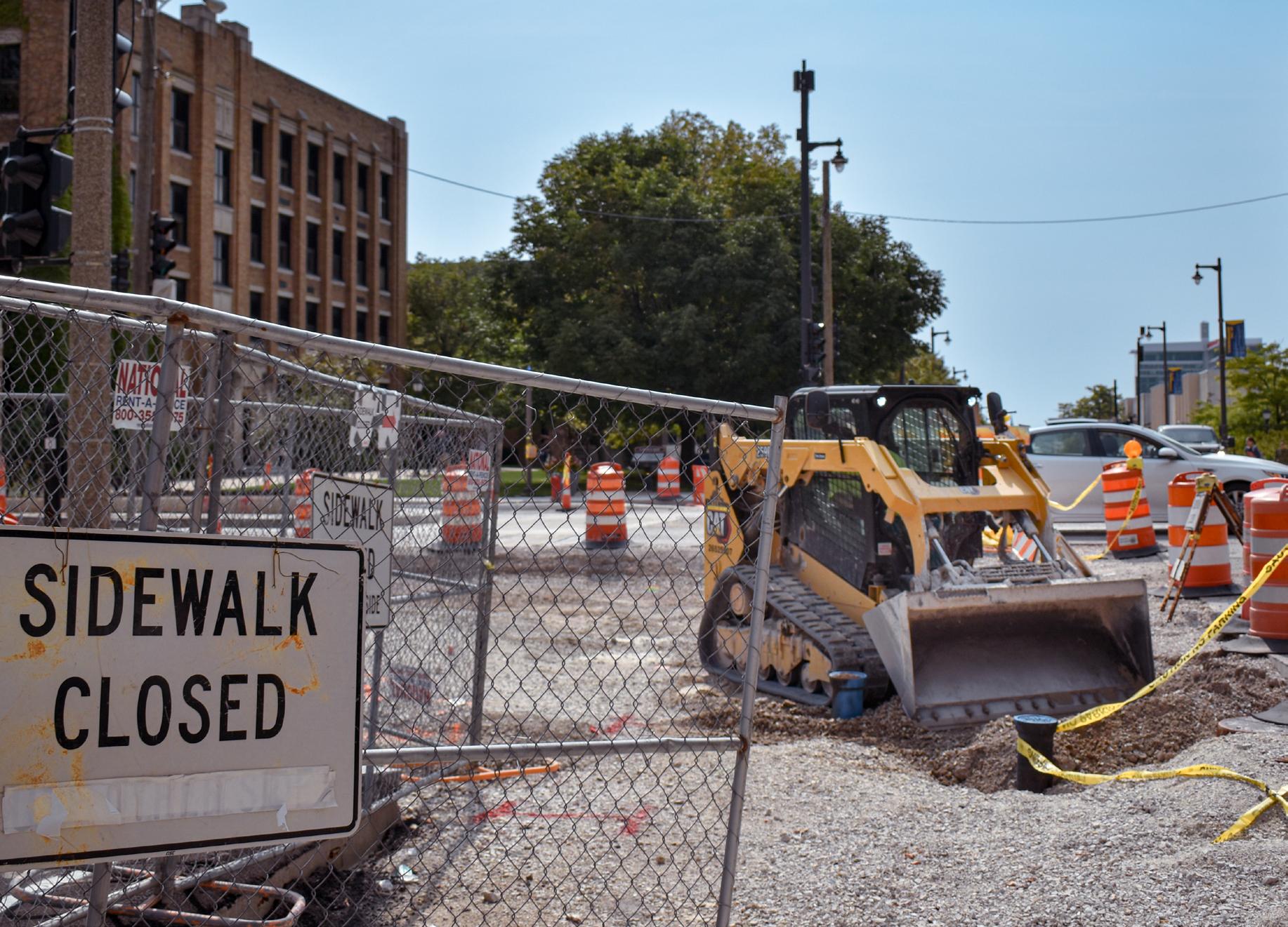 Orange cones, poles and construction barrels tied to gether with yellow caution tape line campus sidewalks and crosswalks along Wiscon sin Avenue. Curbs are miss ing in some spots, and in oth ers, the sidewalks have been moved further into the street.