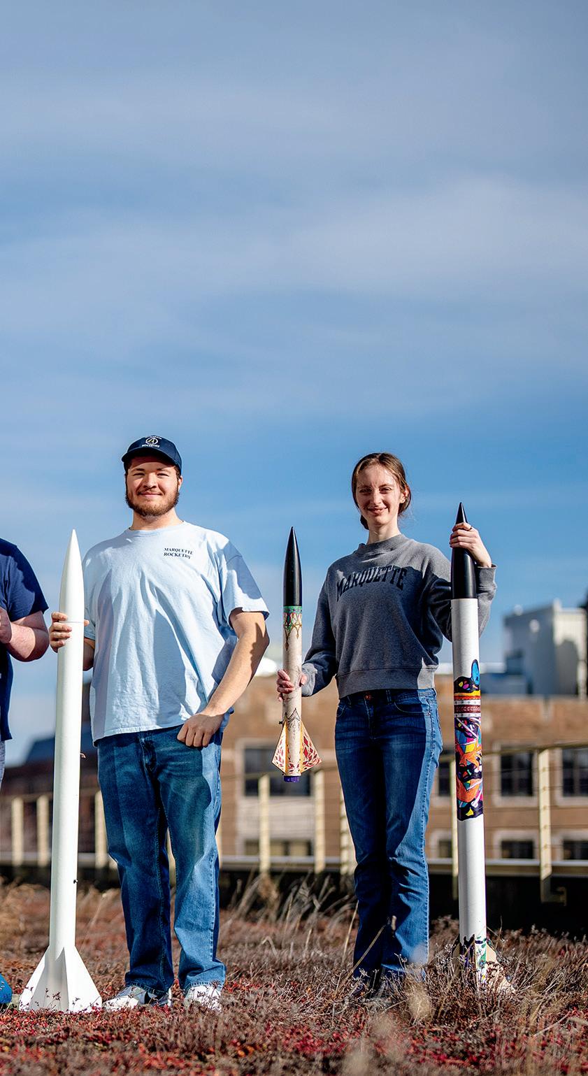 Esto es ciencia aeroespacial: Marquette Rocketry, una de nuestras más de 20 organizaciones de estudiantes de ingeniería, se lanzó al éxito en solo pocos años. Compite por el estado para construir un cohete que pueda transportar una carga útil, volar hasta una altura objetivo de más de 2,400 pies, eyectar la carga y tomar una foto del sitio de aterrizaje cuando llegue al suelo. Si eso suena demasiado lejano, simplemente disfruta aprendiendo los fundamentos de la construcción de cohetes, utilizando software de simulación de cohetes y lanzando cohetes geniales.