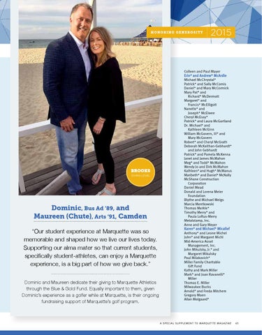 Dominic, Bus Ad ’89, and Maureen (Chute), Arts ’91, Camden “Our student experience at Marquette was so memorable and shaped how we live our lives today. Supporting our alma mater so that current students, specifically student-athletes, can enjoy a Marquette experience, is a big part of how we give back.” Dominic and Maureen dedicate their giving to Marquette Athletics through the Blue & Gold Fund. Equally important to them, given Dominic’s experience as a golfer while at Marquette, is their ongoing fundraising support of Marquette’s golf program.