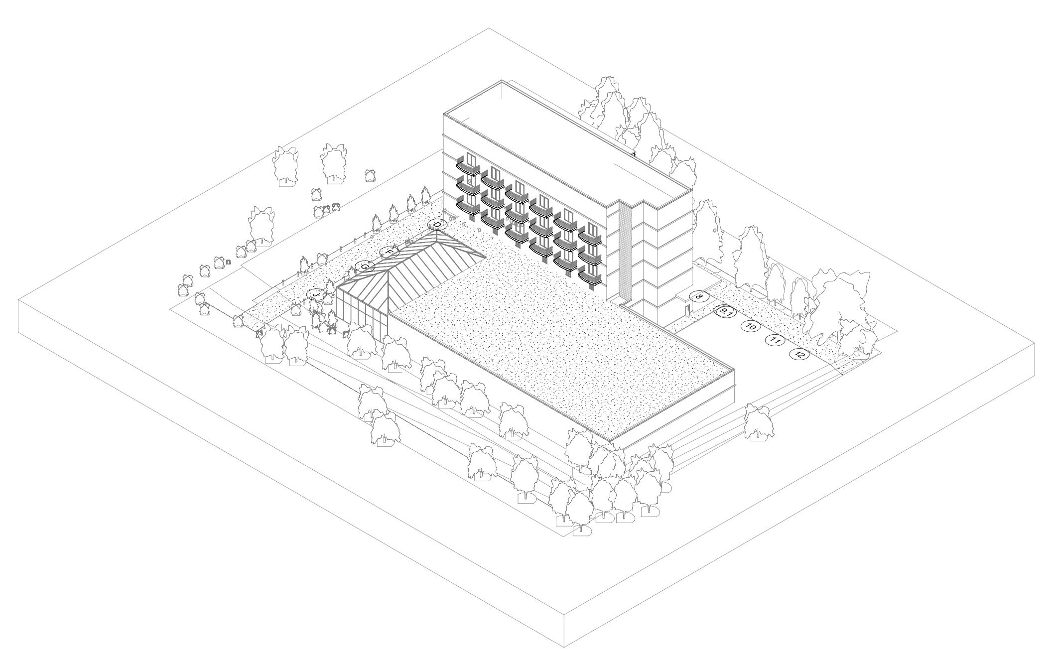 The diagram on the right shows the Model as its parts and levels. The building as you can see consist of a main building, one story conference area and a pool area. On top of the main building one can see four stories with there respective rooms and starways.