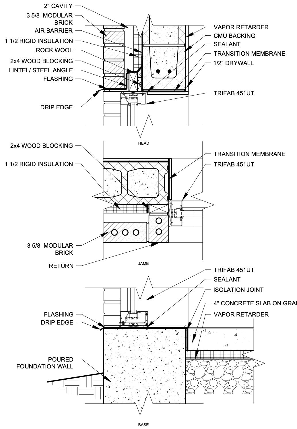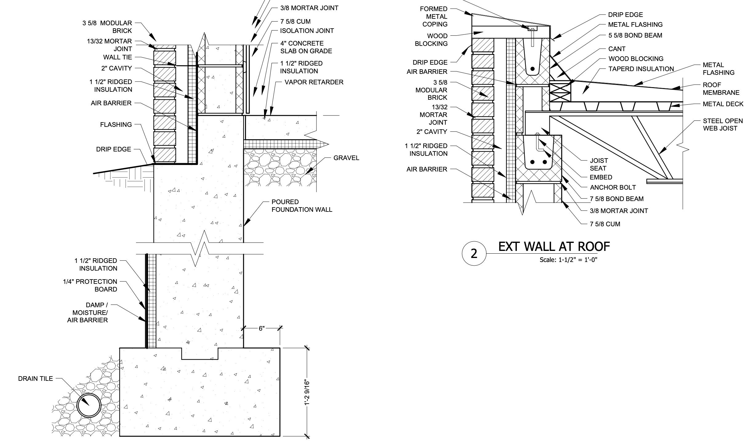 Here are two detail one of a wall and one of a parapet design of the office building. The wall detaill shows the relation ship between the footing up to the foundation wall all the way up to the base of the exterior wall. It gives breakdown of the pices that a commonly found with in exterior cmu wall .