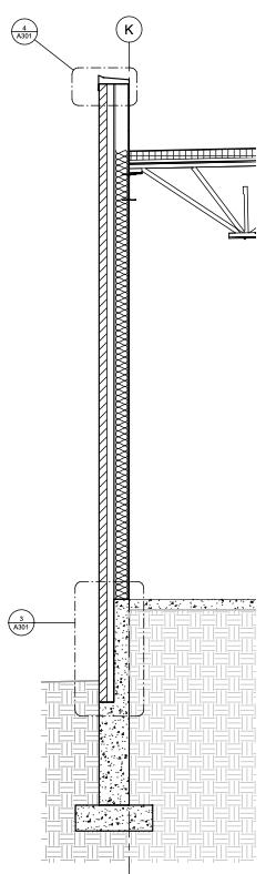 7 5/8 CUM POURED FOUNDATION WALL 4" CONCRETE SLAB ON GRADE 3/8 MORTAR JOINT 3 5/8 MODULAR BRICK 13/32 MORTAR JOINT 2" CAVITY 1 1/2" RIDGED INSULATION AIR BARRIER 7 5/8 CUM 3/8 MORTAR JOINT STEEL OPEN WEB JOIST CANT METAL FLASHING METAL FLASHING WOOD BLOCKING WOOD BLOCKING METAL DECK TAPERD INSULATION ROOF MEMBRANE FORMED METAL COPING EMBED JOIST SEAT 5 5/8 BOND BEAM 7 5/8 BOND BEAM ANCHOR BOLT DRIP EDGE ANCHOR BOLT DRIP EDGE Scale: 1-1/2" = 1'-0"