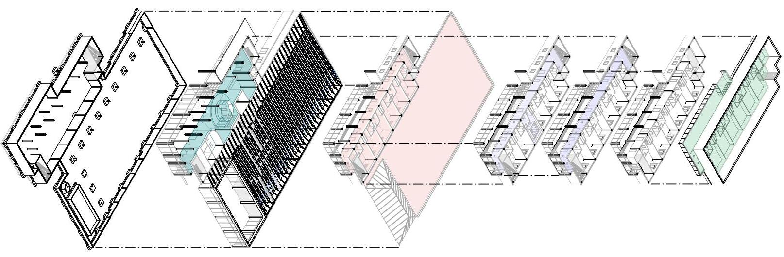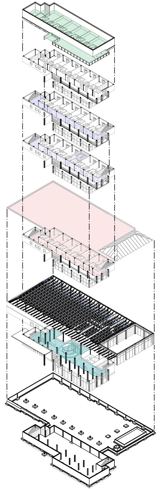 The diagram on the right shows the Model as its parts and levels. The building as you can see consist of a main building, one story conference area and a pool area. On top of the main building one can see four stories with there respective rooms and starways.