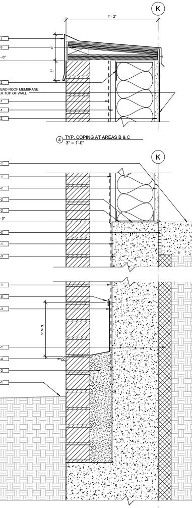Scale Project number Date Drawn by Checked S900 FOUNDATION ISOMETRICS Project Number Project Name Owner Issue Date Author Checker VIEW FROM NORTHWEST K 7-1 6-1 6-2 5-2 7-2 7-1 3-1 3-2 4-3 4-4 3-1 2-1 3-3 100' K 120' 0" 7-1 6-1 5-2 6-2 6-3 EXTEND ROOF MEMBRANE OVER TOP OF WALL K A301 A301 ASST. NO. ?/??/???? A301 Keynote Legend Key Value Keynote Text 2-1SLOPE GRADE AWAY FROM BUILDING 3-12” RIGID FOUNDATION INSULATION 3-2½” SEPARATION BOARD 3-3CONCRETE FOUNDATION WALL. REFER TO STRUCTURAL DRAWINGS 4-2GROUT FULLY BENEATH FLASHING 4-3THROUGH WALL FLASHING 4-4METAL DRIP EDGE 4-5TERMINATION BAR WITH SEALANT 5-1METAL PREFINISHED METAL COPING 5-26” COLD FORMED METAL FRAMING WITH FIBERGLASS BATTS 6-1GLASS MAT GYPSUM BOARD SHEATHING 6-2GYPSUM BOARD 6-3PRESSURE TREATED WOOD BLOCKING 7-1AIR/ MOISTURE BARRIER 7-2VAPOR BARRIER 3" = 1'-0" 3 BASE FLASHING DETAIL 3" 1'-0" TYP. COPING AT AREAS B & C 1/2" 1'-0" WALL SECTION AT CONF. ROOMS 2 WALL ISOMETRIC AT CONF. ROOMS SC-2 CPT-1 EP-1 EP-2 EP-3 EP-4 EP-5 EP-6 EP-7 WD-1 WD-2 WD-3 SC-1 FINISH LEGEND ACCENT WALL ACCENT WALL EP-1 EP-2 EP-3 EP-2 EP-4 EP-2 WD-2 EP-5 EP-6 EP-7 EP-6 EP-7 RECEPTION 106 SC-2 RB-1 PT-1 RECEPTION OFC 100B KITCHEN 102A SERVING 102 LOBBY 100 STAIR S1 MEN T-1 WOMEN T-2 JANITOR M-1 CORRIDOR COR-1 STAIR S2 DINNING 101 LOUNGE 102 ELEVATOR 96 PT-1 CPT-1 RB-1 PT-1 SC-1 RB-1 PT-1 SC-2 RB-1 PT-1 WD-1 WB-1 PT-1 SC-2 RB-1 PT-3 SC-1 RB-1 PT-1 SC-3 RB-1 PT-1 WD-3 WB-3 PT-1 WD-3 WB-3 PT-1 WD-3 WB-3 PT-1 SC-1 RB-1 PT-1 SC-1 RB-1 PT-1 E D C B A 1 1.4 2 3 4 5 6 7 8 8.5 9.19 Scale Project number Date Drawn Checked by ISSUANCE AND REVISION 1/8" = 1'-0" A131 Project Number Issue Date Author Checker Room Schedule Number Room Name Floor Finish Base Finish Wall Finish Area North Wall South Wall East Wall West Wall 106 RECEPTION SC-1 RB-1 PT-1 PT-1 PT-1 PT-1 195 SF 100B RECEPTION OFC CPT-1 WB-4 PT-1 PT-1 PT-1 PT-1 234 SF 102A KITCHEN SC-3 RB-1 PT-2 PT-2 PT-2 PT-2 363 SF 102 SERVING WD-1 WB-1 PT-1 PT-1 PT-1 PT-1 261 SF 100 LOBBY SC-2 RB-1 PT-1 PT-1 PT-1 PT-1 1682 SF S1 STAIR SC-1 RB-1 PT-1 PT-1 PT-1 PT-1 217 SF T-1 MEN SC-3 RB-1 PT-3 PT-3 PT-3 PT-3 71 SF T-2 WOMEN SC-3 RB-1 PT-1 PT-1 PT-1 PT-1 70 SF M-1 JANITOR SC-3 RB-1 PT-1 PT-1 PT-1 PT-1 49 SF COR-1 CORRIDOR WD-3 WB-3 PT-1 PT-1 PT-1 PT-1 171 SF S2 STAIR SC-1 RB-1 PT-1 PT-1 PT-1 PT-1 213 SF 101 DINNING WD-3 WB-3 PT-1 PT-1 PT-1 PT-1 814 SF 102 LOUNGE WD-3 WB-3 PT-1 PT-1 PT-1 PT-1 811 SF 96 ELEVATOR PT-1 PT-1 PT-1 PT-1 68 SF TADAO ANDO MEMORIAL PAVILION