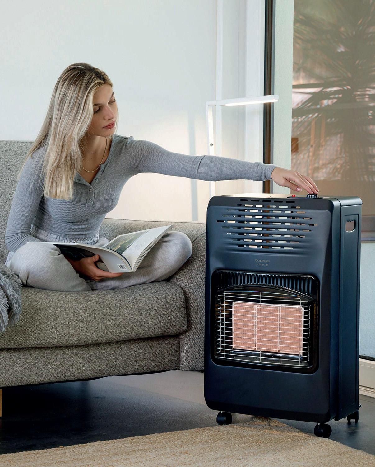 manera rápida, homogénea y eficiente por todo el hogar. Destaca por su diseño plegable que permite almacenarla cómodamente durante el resto de año ocupando el mínimo espacio. Y aún más, gracias a su diseño compacto, sus 5 ruedas y sus 2 asas, se puede transportar cómodamente. Tiene alojamiento para una bombona de gas de hasta 15 kg. Su tecnología infrarroja o radiante ayuda a minimizar el consumo, gracias a la combustión del gas en el quemador, un sistema que emite calor por convención y radiación y lo transmite rápidamente a los objetos y las personas que están cerca.