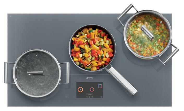 Smeg total inducción permite una flexibilidad absoluta para cocinar. Se pueden colocar hasta seis utensilios de cocina sobre la placa de forma independiente y en cualquier lugar. Con superficie de Glassy Ceran en color silver o negro con serigrafía debajo del vidrio y display TFT de 7” a color, dispone de temporizadores independientes para cada utensilio y de un menú configuración para ajustar diferentes parámetros como la luminosidad, sonido y el bloqueo de mandos. La gama aporta 17 configuraciones de nivel de potencia, EcoLogic Advance, pausa/bloqueo pantalla y posibilidad de conexión trifásica o bifásica; así como novedosas funciones como Derretir 44 ºC, Mantener caliente 70 ºC y Hervir 94 ºC.