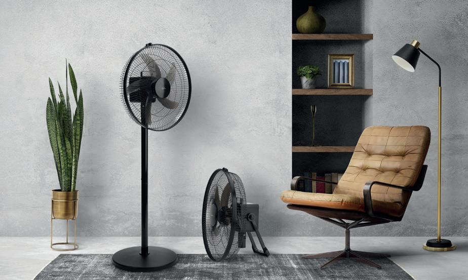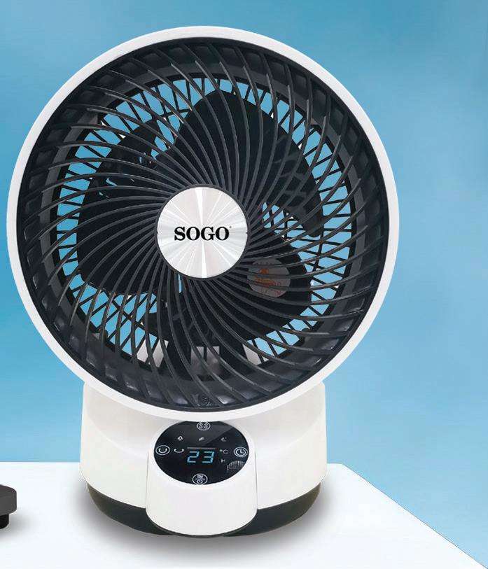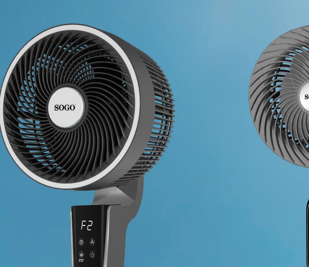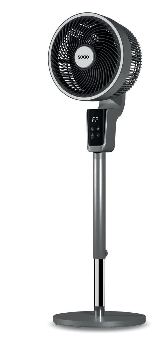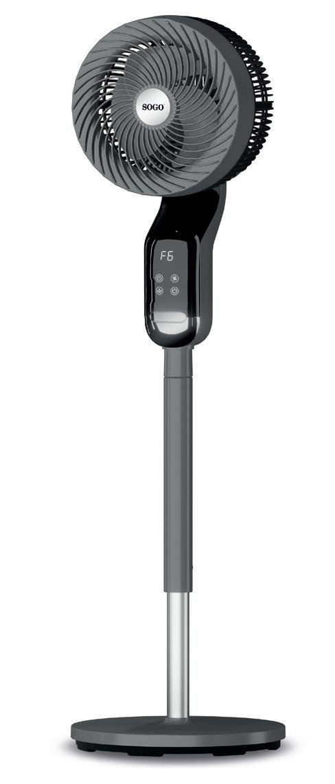 Para este estudio, Sogo ha destacado tres innovadores. El ventilador de pie Deluxe 12" SS-21340 ofrece una alta potencia (70 W) y un bajo ruido. Equipado con un motor de gran rendimiento, así como con pantalla digital de apagado automático con temperatura ambiente y panel de control táctil, cuenta con 3 velocidades y con las funciones de Oscilación 3D, Circulación de Vórtice y Aroma. Con altura ajustable, dispone también de función Temporizador 12 h y de mando a distancia. A destacar que los ajustes fijos o de oscilación permiten la máxima flexibilidad. En lo que respecta a seguridad, brinda protección contra sobrecalentamiento, a la vez que incluye rejilla de protección desmontable para seguridad del usuario que, además, facilita la limpieza.
