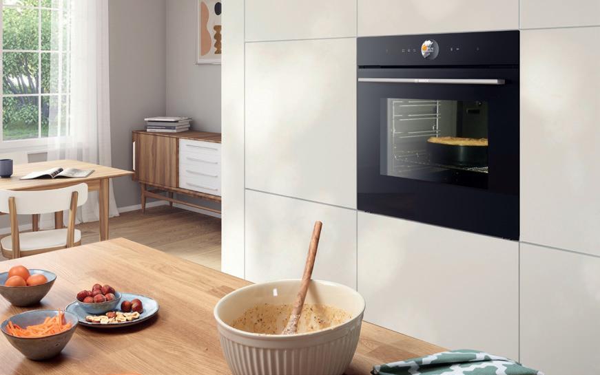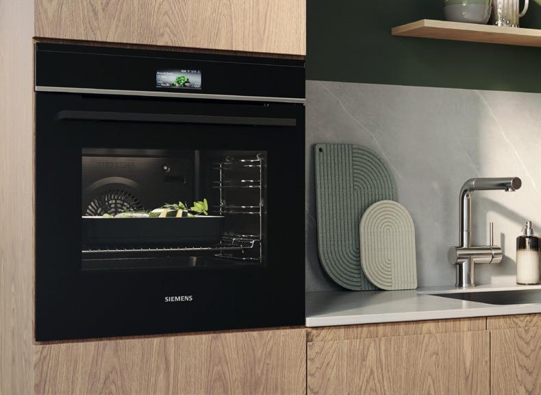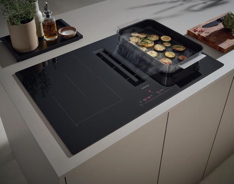 La renovada gama de placas con extractor integrado Siemens cuenta con medidas en 60, 70 y 80 cm de ancho. El nuevo modelo de 80 cm tiene una zona gigante de 28 cm. La flexInducción ofrece una flexibilidad total. Estas placas se conectan al móvil vía Home Connect que permite acceder a un amplio surtido de recetas automáticas, manejar los ajustes desde el móvil o activar el control de temperatura para sartenes fryingSensor. Gracias al sensor de calidad de aire, el extractor detecta de forma automática el nivel de humos y olores de la estancia, ajustando el nivel de potencia. Su motor iQDrive™ reduce los niveles de ruido y las pérdidas de calor durante la extracción. Con puerta de cristal negro sin marcos, panel de control sin botones y un sutil tirador en color negro, la nueva gama de hornos compactos iQ700 ofrecen precalentamiento rápido, función coolStart para cocinar los alimentos sin descongelarlos antes y programas automáticos. También disponen de funcionamiento varioSpeed, microondas integrado, función AirFry y función CrispFinish para obtener unos resultados más crujientes. La autolimpieza pirolítica además del asistente de limpieza humidClean, facilitan la limpieza.