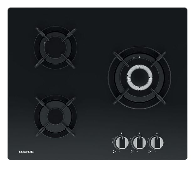 La placa de gas con tres fuegos Taurus GC3HN ofrece 6,35 kW de potencia total: quemador wok triple de 3.500 W, quemador semi rápido de 1.800 W y quemador auxiliar de 1.050 W. Fabricado con vidrio templado de fácil limpieza y resistente al calor de 8 mm, cuenta con longitud de llama ajustable, encendido automático de llama, válvulas de seguridad y dispositivo de protección anti fuga de gas que cierra automáticamente la salida del gas si no se detecta llama. Está preparada para gas natural con opción a gas butano/propano. Como complemento la marca propone su campana decorativa T90IXAL, en acero inoxidable y con frontal de cristal negro. Con 90 cm de ancho y 200 W de potencia brida una óptima absorción de humos y olores gracias a sus 650 m3/h de capacidad de extracción. Equipada con panel de control táctil, filtro de aluminio lavables multicapa e iluminación LED, dispone de 3 velocidades, dos modos de funcionamiento (extracción y recirculación), temporizador de desconexión automática e indicador de saturación de filtro. Incluye kit completo de instalación. Tiene clase A de eficiencia energética.