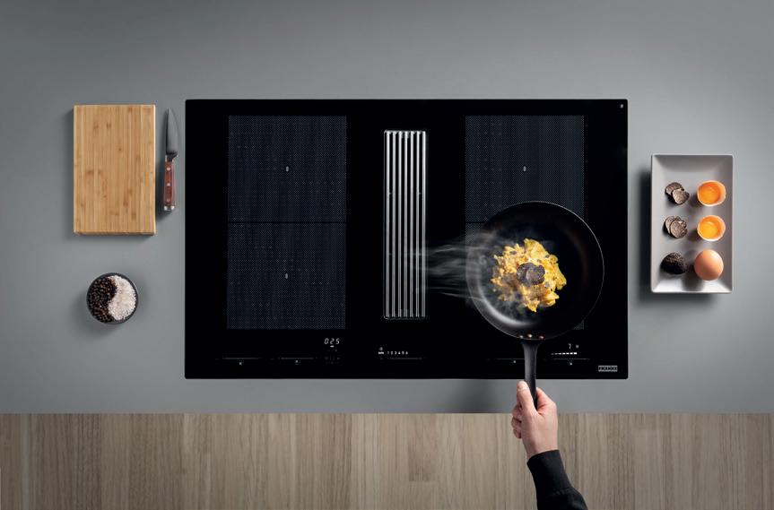 La campana extractora integrada Maris FST Drip-Free 90 de Franke, con un ancho de 90 cm y un elegante acabado en acero inoxidable, esta campana no sólo elimina eficazmente olores y humo, sino que también protege la cocina de la condensación gracias a la innovadora tecnología Drip Free. Además, cuenta con una visera de cristal negra, que también protege los muebles del daño que puede causar la humedad y el goteo. Ofrece 3 velocidades más una función intensiva Boost y una capacidad de extracción de hasta 710 m³/h en modo Boost. Incluye dos luces Led y es clase A en eficiencia energética. Otro de los productos más interesantes de la marca es la placa con campana extractora integrada Mythos 2gether Icon Steel FMY 8391R HI, en acero inoxidable. Brinda una capacidad de extracción de 600 m³/h en modo Boost y una presión máxima de 670 Pa, con un nivel sonoro mínimo de 49 dB(A). Dispone de 4 zonas de inducción y función Booster. Además, cuenta con zona puente. Asimismo, destacar las funciones Stop&Go, Derretir y Bloqueo de seguridad para niños. Está clasificada con una eficiencia energética A+.