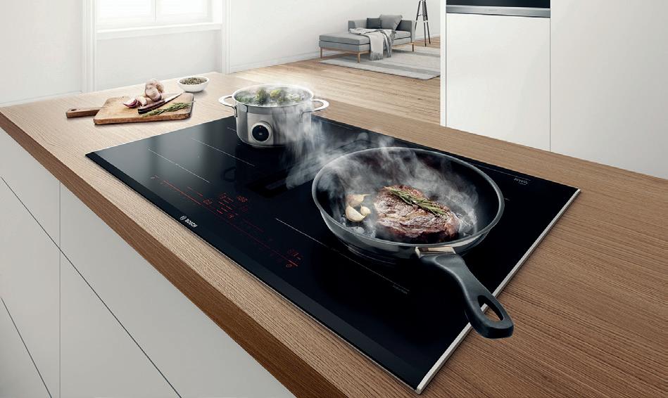 La placa de inducción con extractor integrado Serie 8 de Bosch destaca por su FlexInducción, que permite usar recipientes de distintos tamaños en cualquier zona; así como por su tecnología PerfectFry, que garantiza la temperatura óptima del aceite para que los alimentos no se quemen. También dispone de función Sprint (calentamiento más rápido) y es compatible con el sensor de cocción PerfectCook que consigue el mejor punto de cocción en cada receta. Su extractor EcoSilence es silencioso y eficiente, con filtros lavables y ajuste automático mediante PerfectAir. Además, Home Connect permite control remoto.