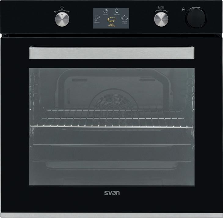 El horno vapor SVH850VAP1 de la firma, en color, cristal negro y 60 cm de ancho posee una capacidad de 78 l y 12 programas: Luz, Arriba+Abajo, Turbo ventilador, Doble grill, Pizza (abajo+Turbo), Cocción al vapor, Descongelar, arriba+abajo+ventilador, Grill, Doble grill ventilador, 3D (arriba+abajo+Turbo) y Limpieza al vapor. Con display TFT LCD de 4,3”, cuenta con termostato electrónico, temporizador digital, mandos joystick , cavidad esmaltada y luz halógena (reemplazable). Además, posee cristal en puerta doble y extraíble. Entre sus principales funciones destacan: Menú AutoCooking 151 recetas, Cortina de aire, Booster, Inyección automática de vapor, Stop&Go (pausa) y Señal Fin de cocción. Es clase A en eficiencia energética. Otros de los hornos más destacados de Svan es SMWC25900DGN, un microondas cerámico de 25 l y 900 W, equipado con control display Led, cavidad interna en acero inoxidable y luz interior Led reemplazable. De libre instalación y sin plato giratorio, dispone de 6 niveles de potencia, grill y cocina combinada (2). Incluye rejilla metálica y funciones tan interesantes como Auto Descongelación, Bloqueo control, Descongelación rápida, Inicio rápido (+30 seg.), Menú Auto Cooking y Temporizador Digital (tiempo/duración) de 99 minutos.