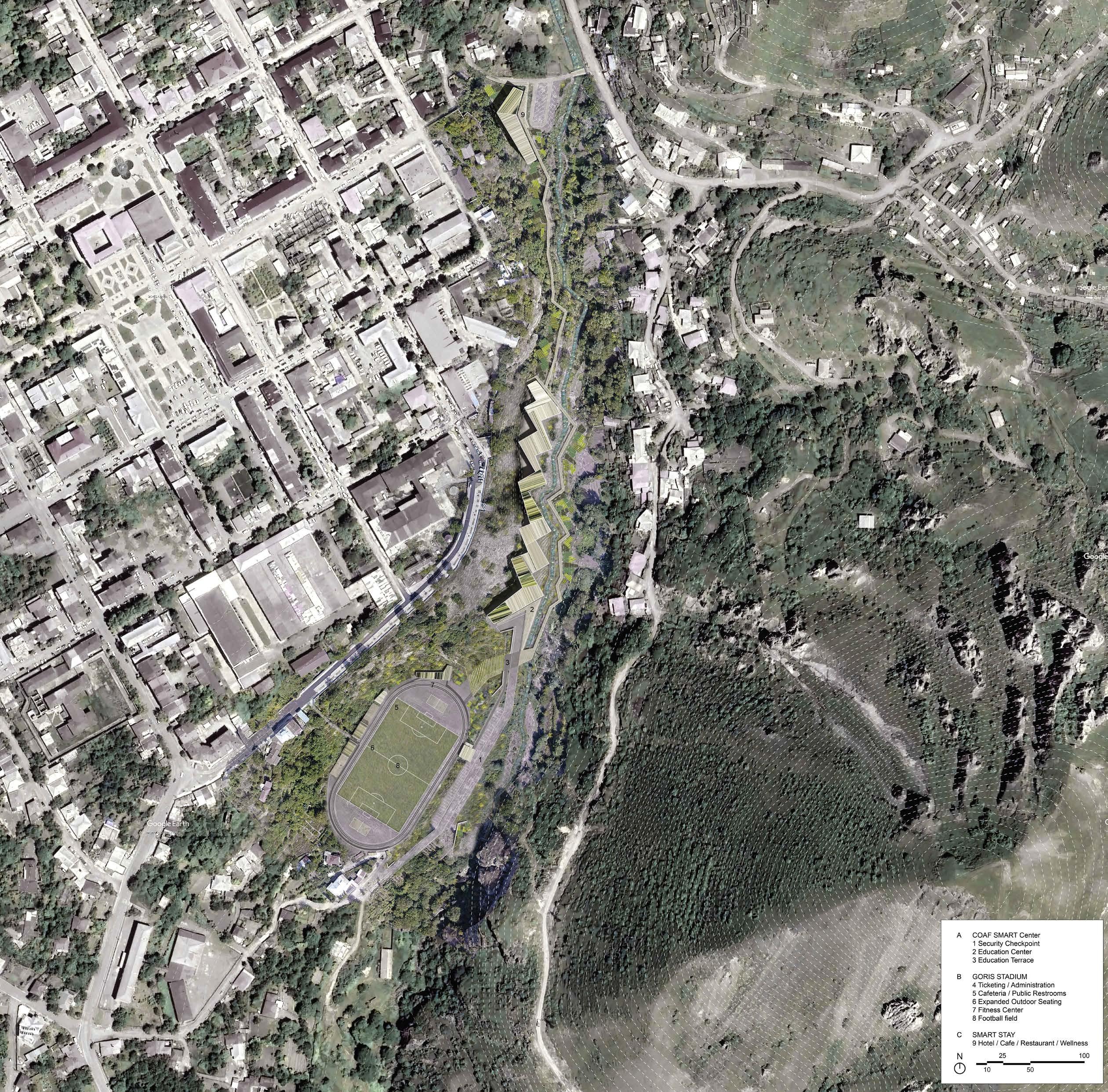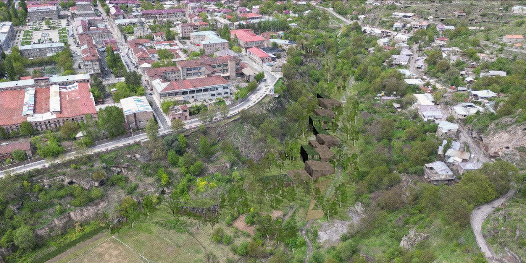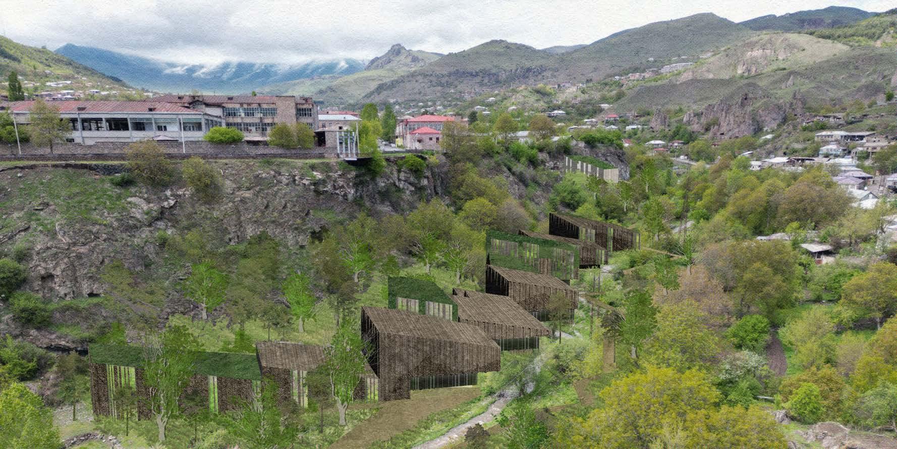The design draws inspiration from the unique beauty of Goris, where geological formations and man-made structures intertwine. This layered context—rich in textures, patterns, and materiality—shapes the project’s spatial and material language. The southern end of the site is anchored by the existing stadium, repurposed as a gateway and community hub. A pedestrian promenade and riverwalk connect visitors to the educational and hospitality facilities, enhancing site connectivity.