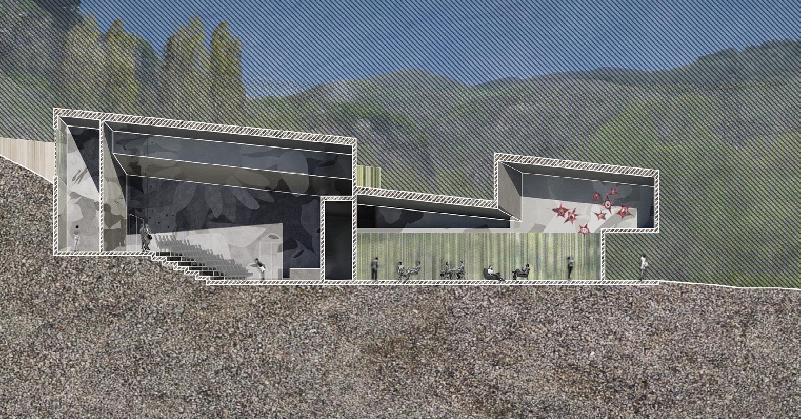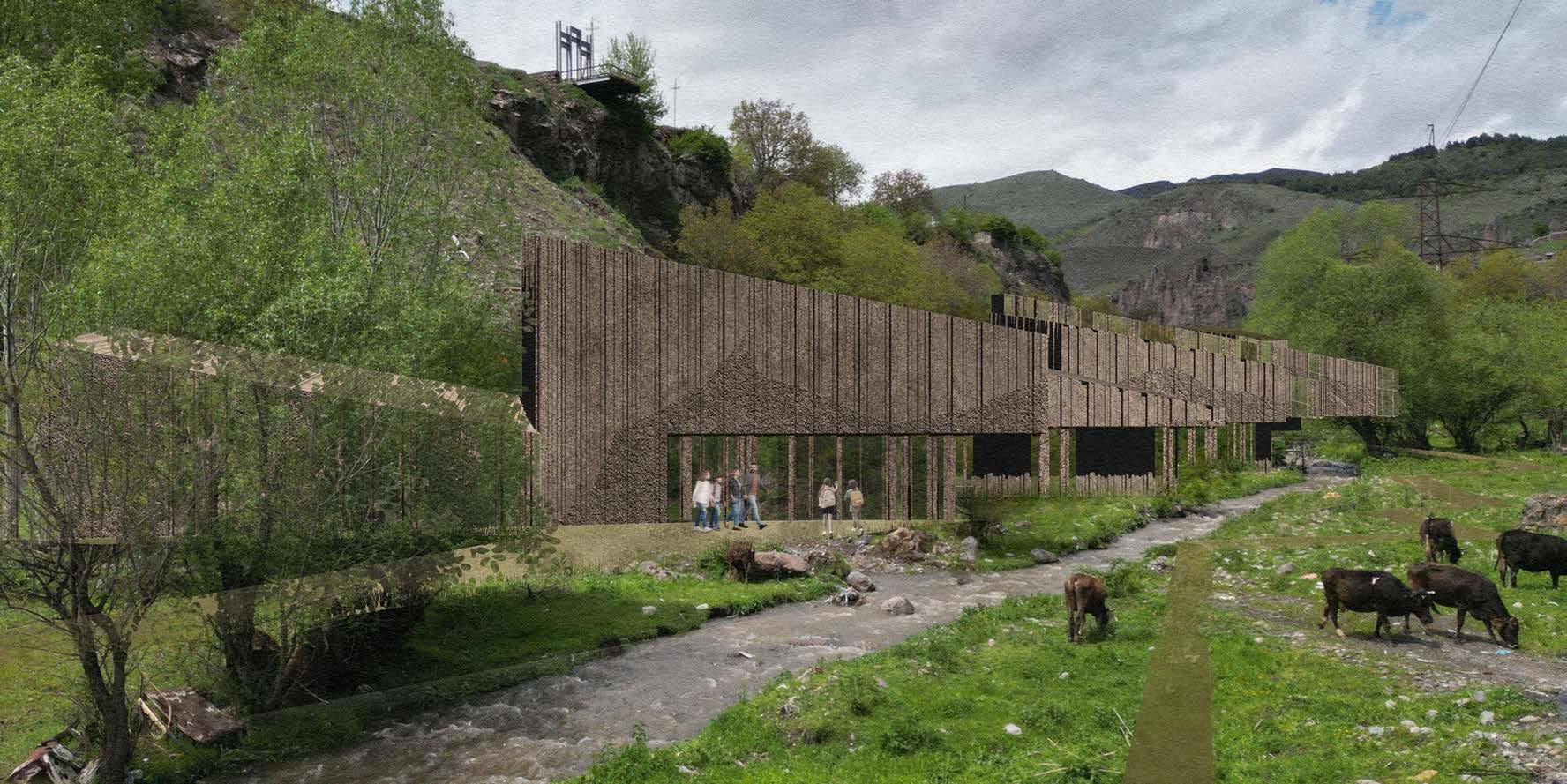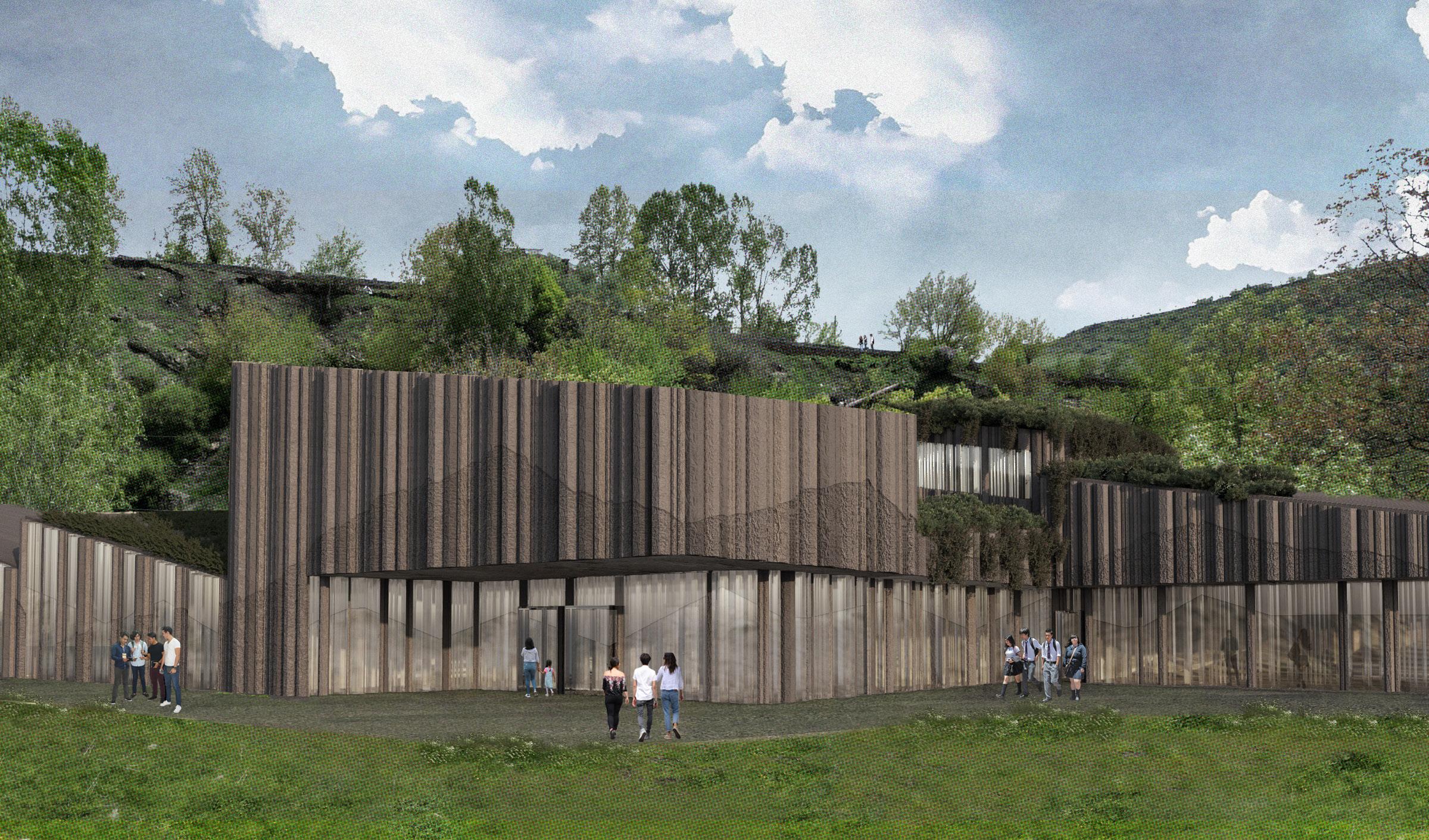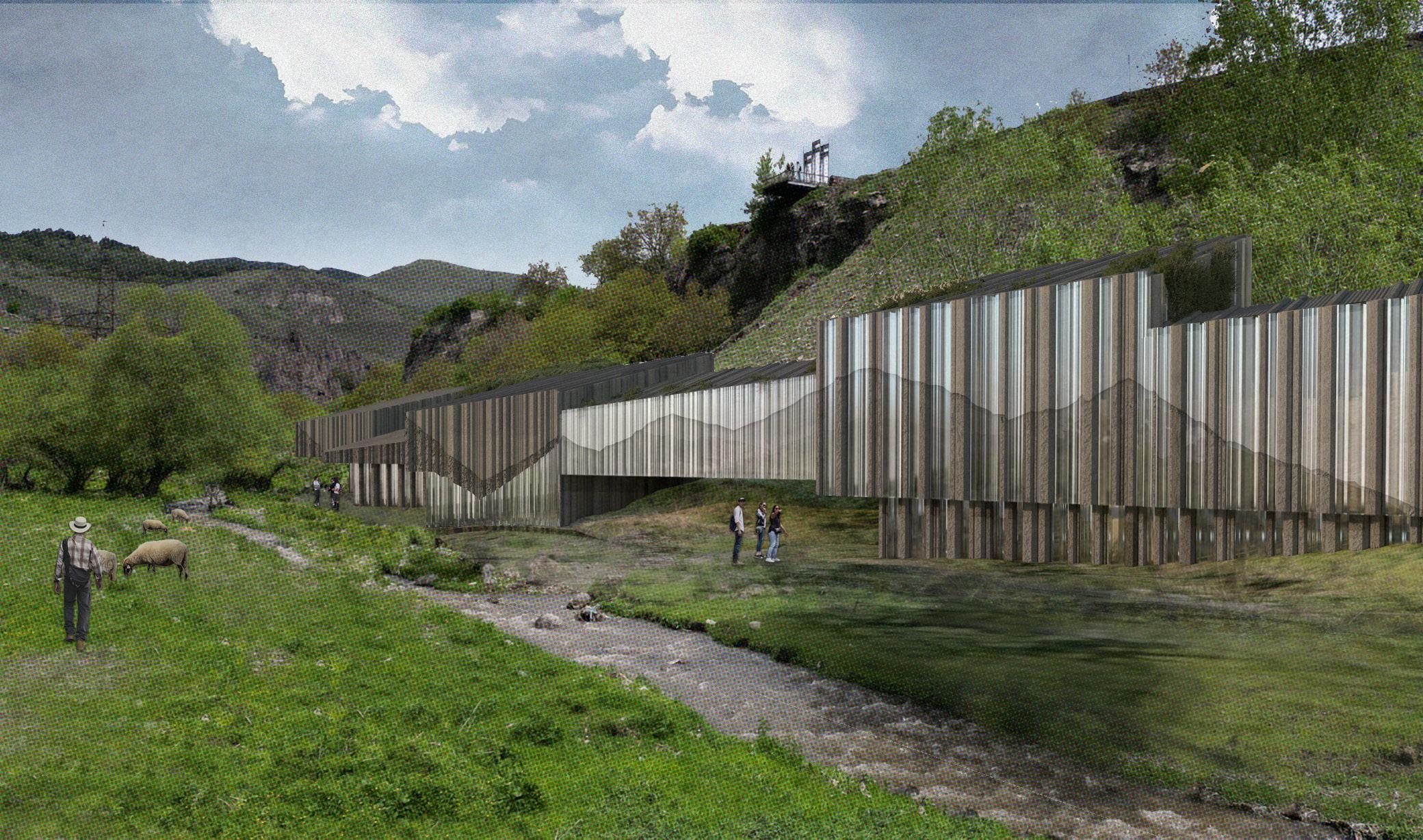 The design draws inspiration from the unique beauty of Goris, where geological formations and man-made structures intertwine. This layered context—rich in textures, patterns, and materiality—shapes the project’s spatial and material language. The southern end of the site is anchored by the existing stadium, repurposed as a gateway and community hub. A pedestrian promenade and riverwalk connect visitors to the educational and hospitality facilities, enhancing site connectivity.