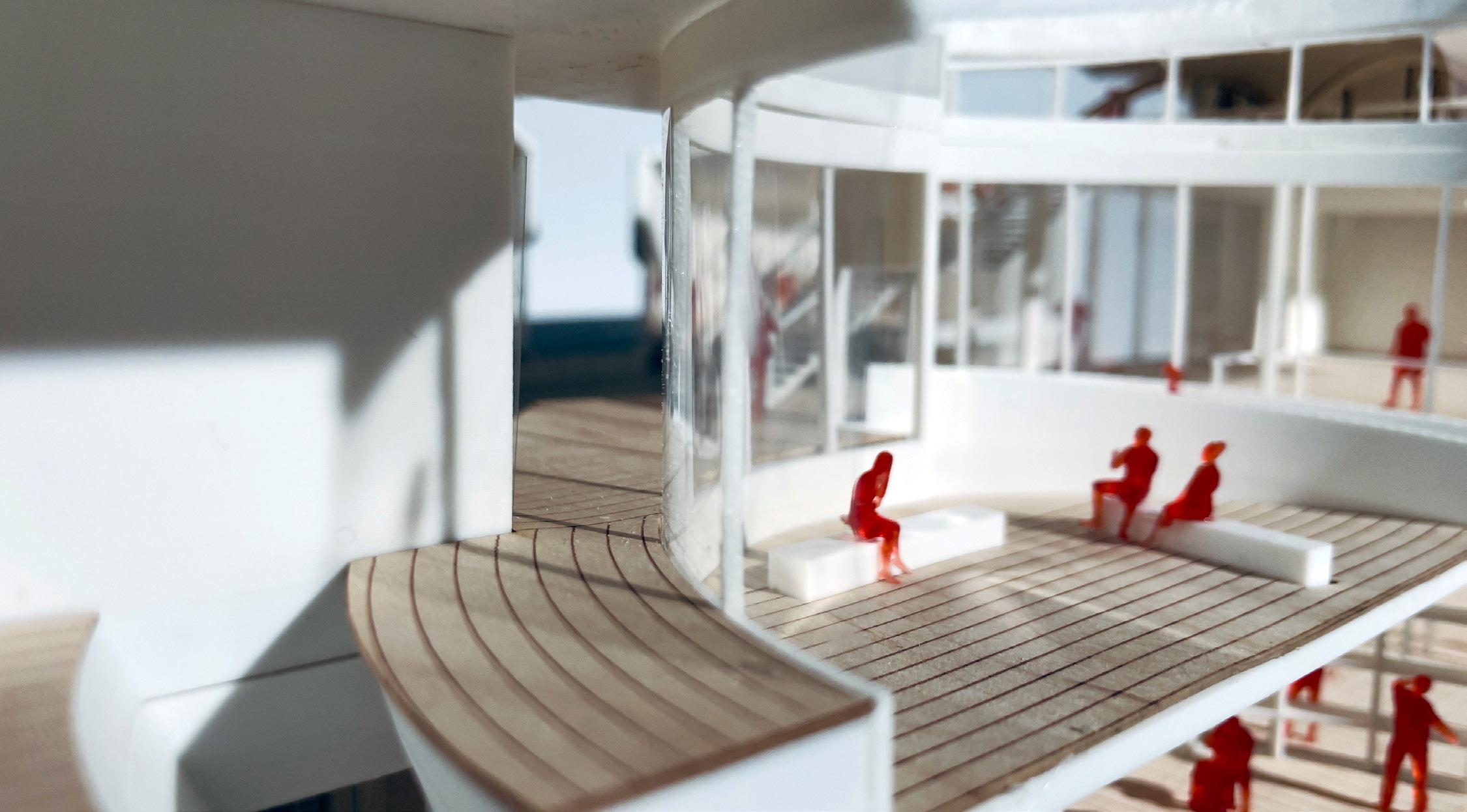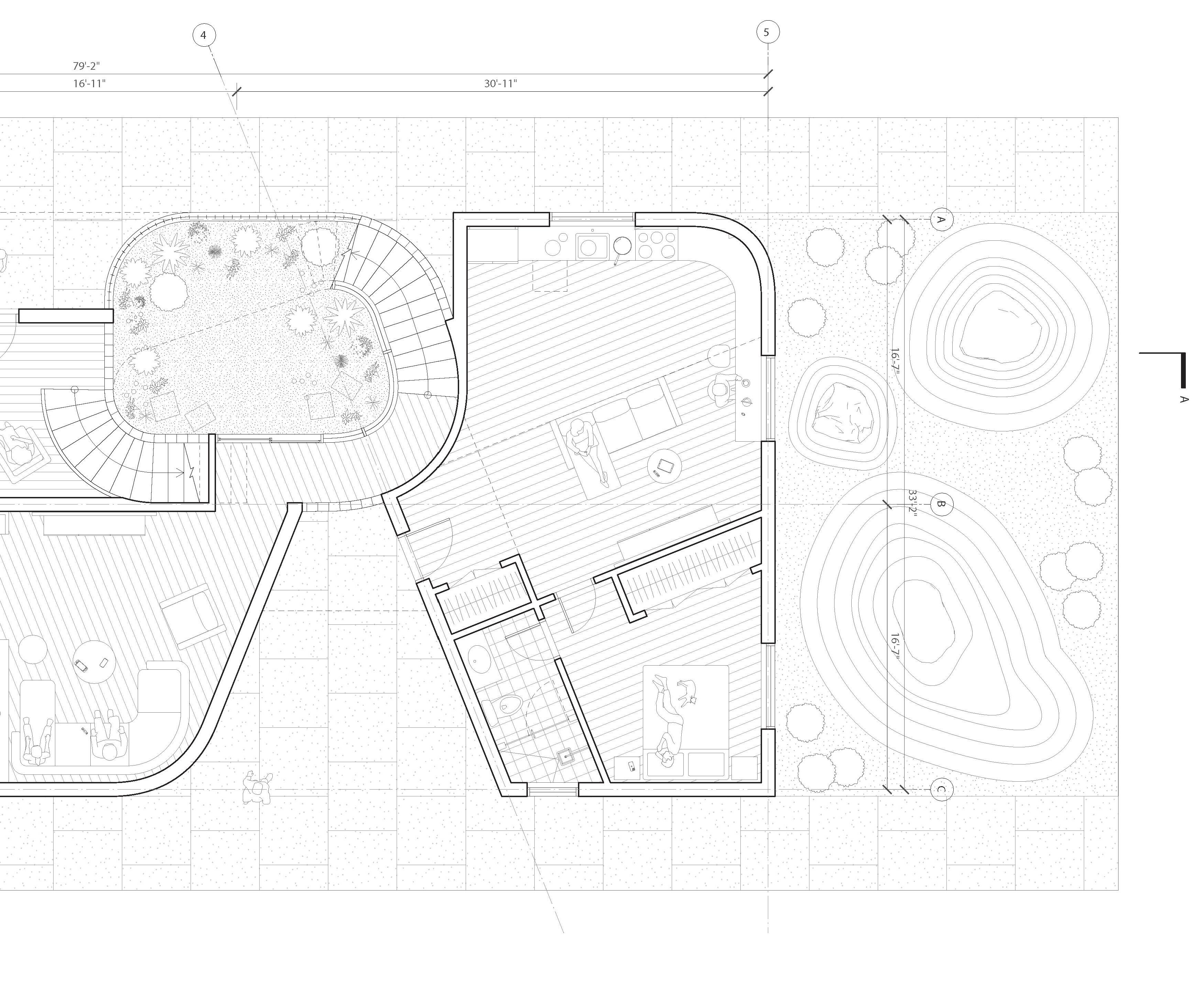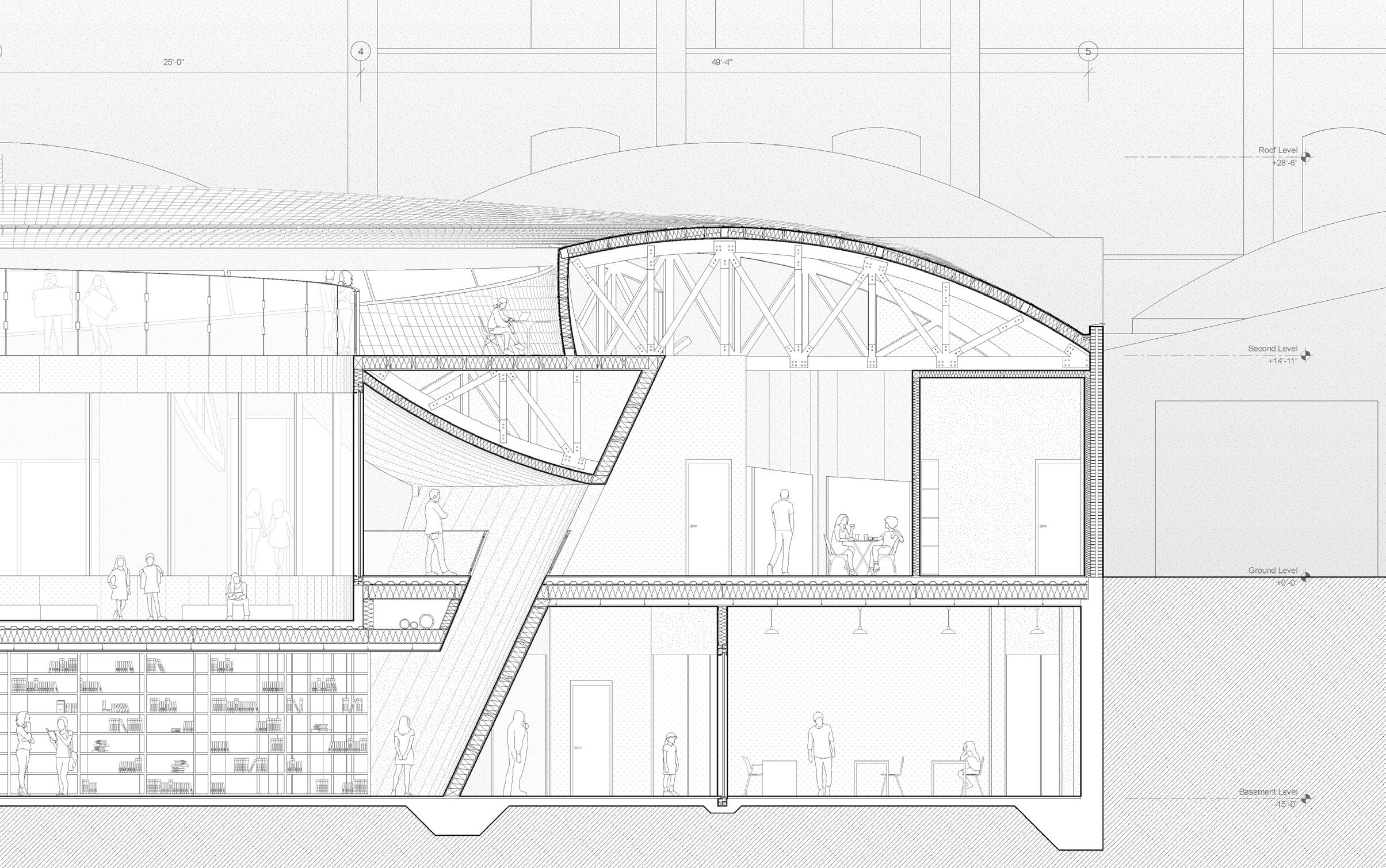 Modified truss profiles are initially used as outdoor terrace spaces and lighting devices, which are then transformed into a roof surface that peels off with hidden joists and structural HSS, creating an integrated system of trusses.
