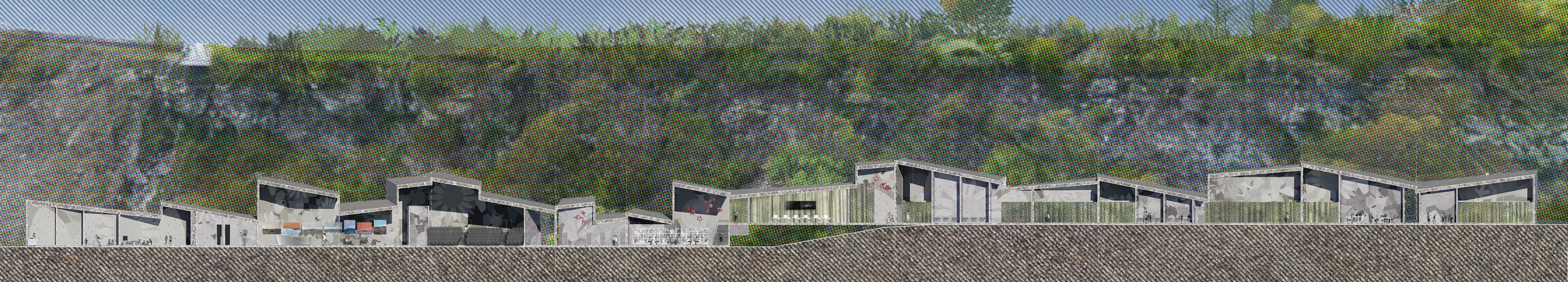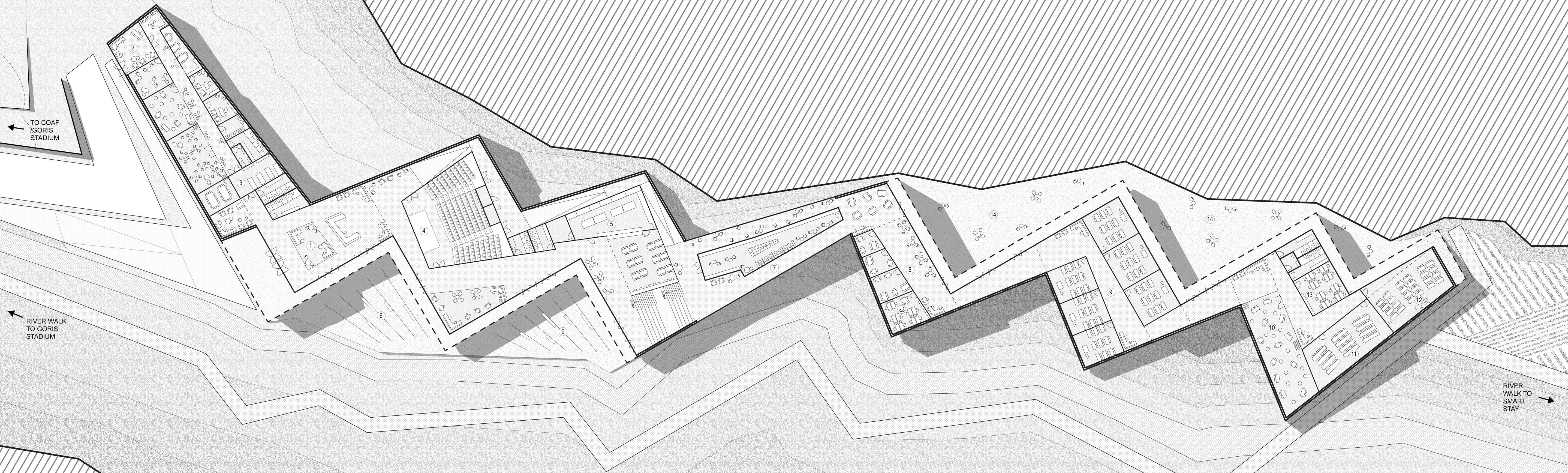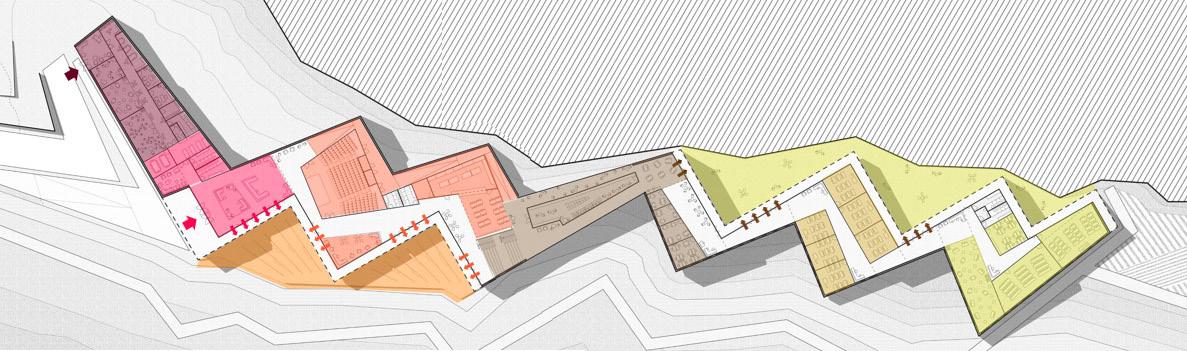 The boutique hotel anchors the northern end, while the educational complex follows a narrow strip along the river. This configuration inspires a stepped lenticular plan aligned with the city grid, creating a dynamic architectural presence. Externally, the stepped form conceals and reveals the building’s massing, while internally, it frames shifting views of the landscape. A central promenade threads the programmatic elements together, serving as circulation, gathering space, and exhibition hall.