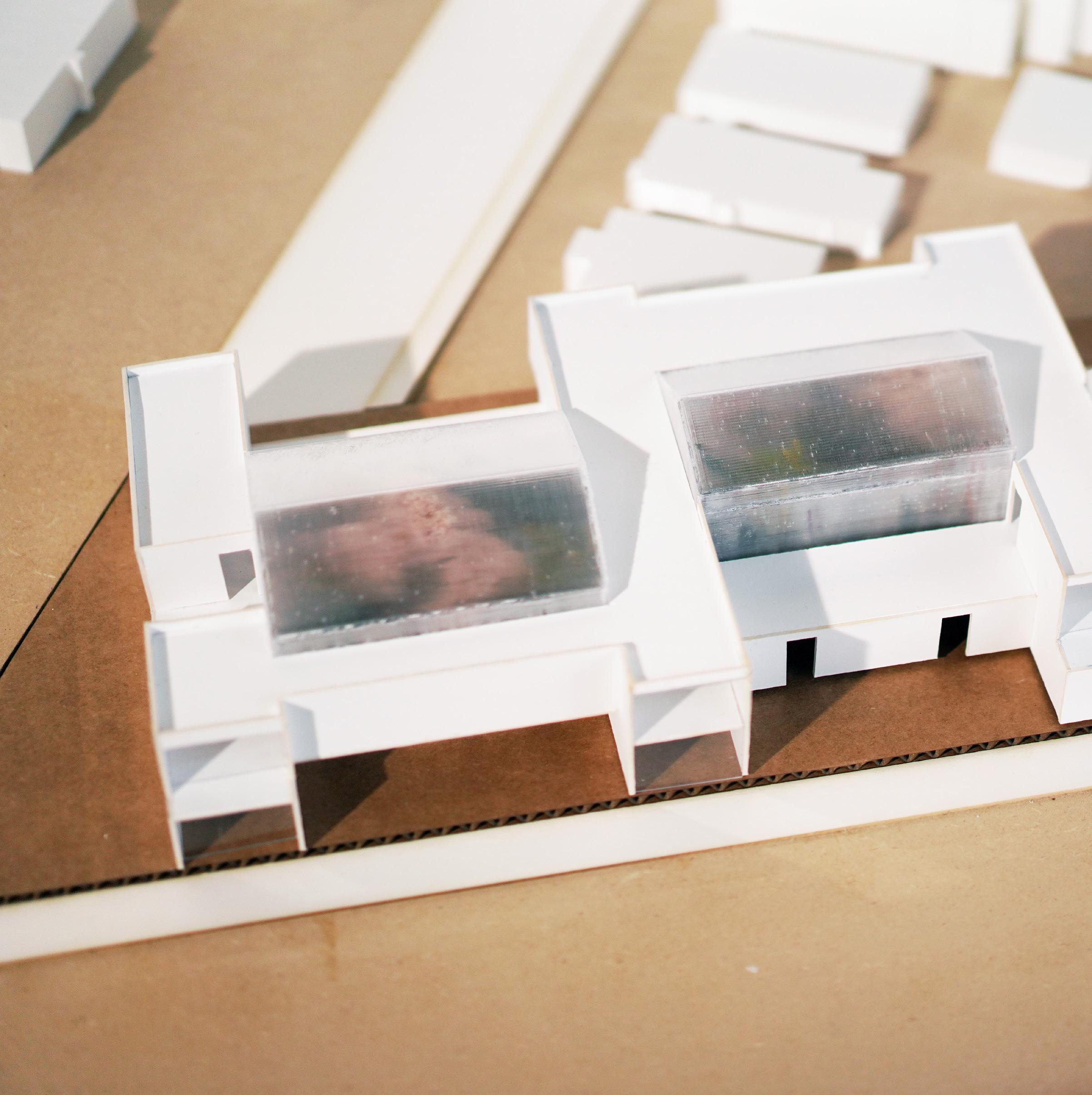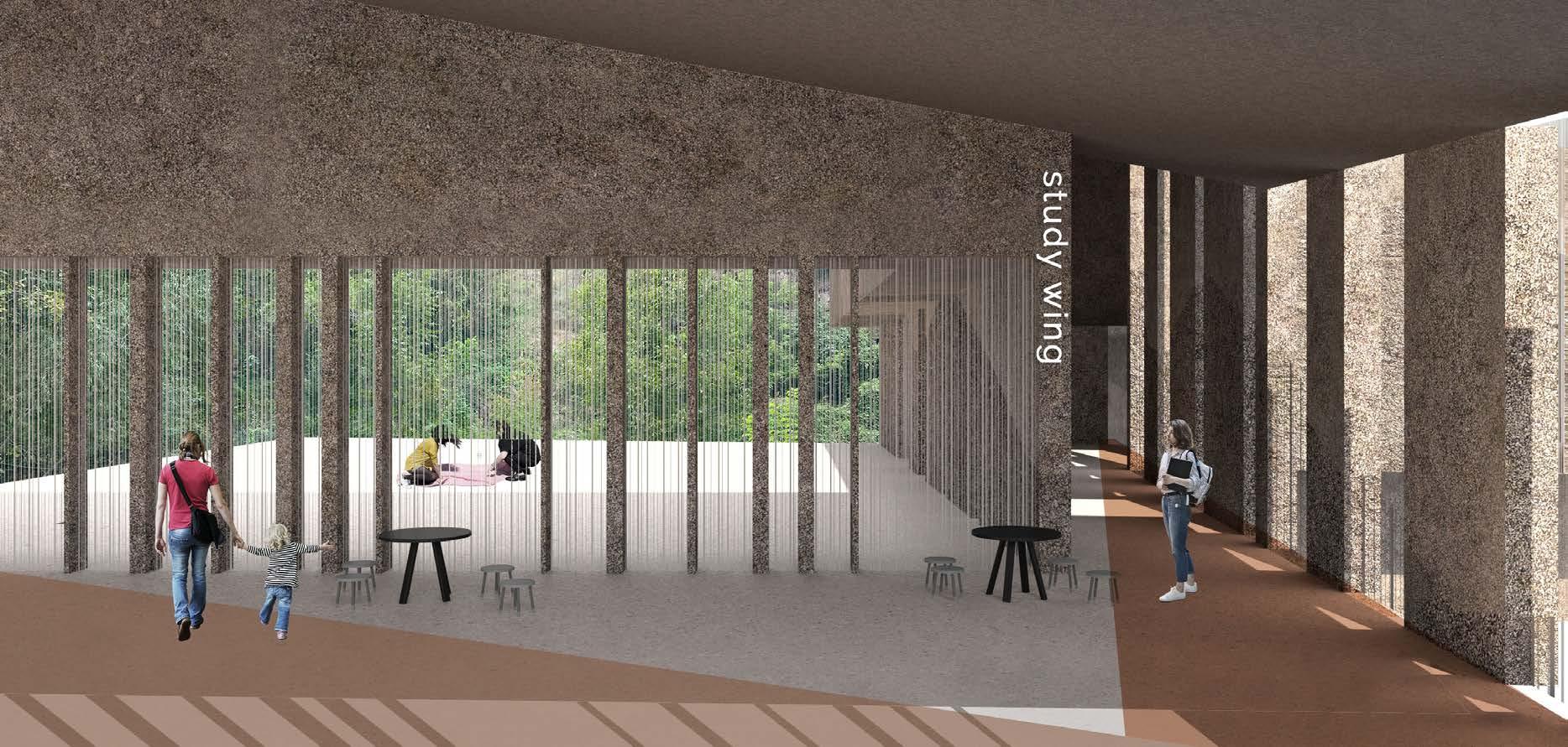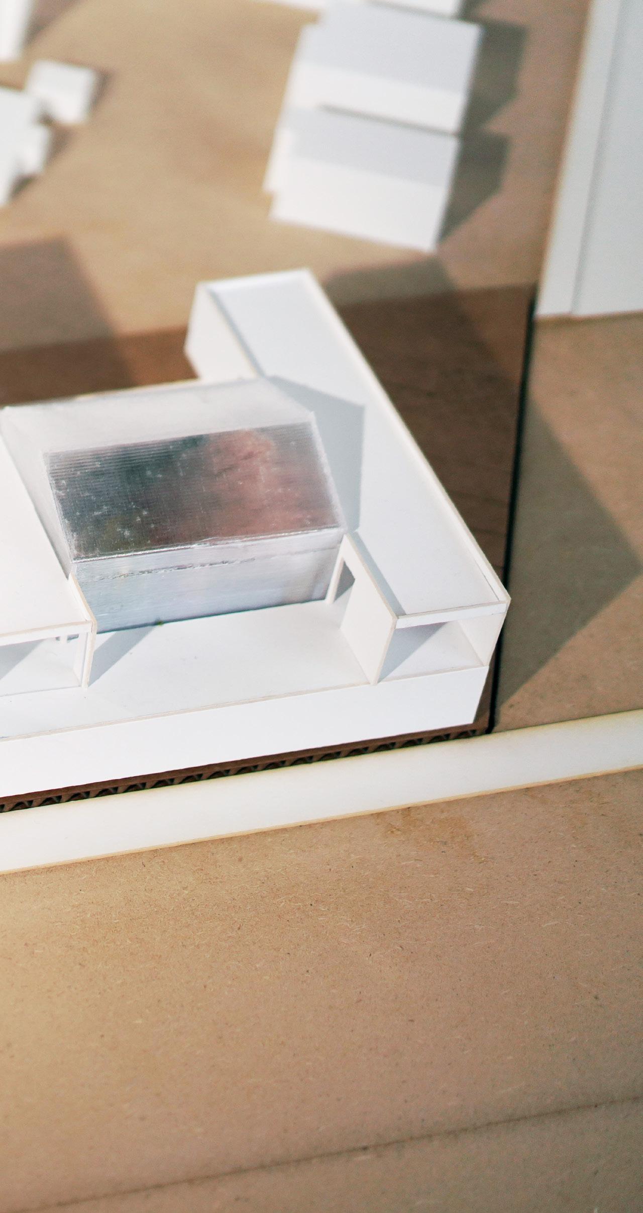 The boutique hotel anchors the northern end, while the educational complex follows a narrow strip along the river. This configuration inspires a stepped lenticular plan aligned with the city grid, creating a dynamic architectural presence. Externally, the stepped form conceals and reveals the building’s massing, while internally, it frames shifting views of the landscape. A central promenade threads the programmatic elements together, serving as circulation, gathering space, and exhibition hall.