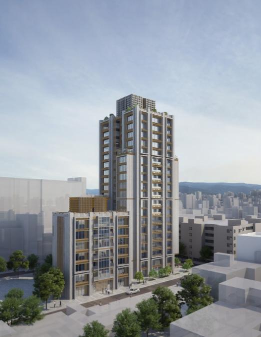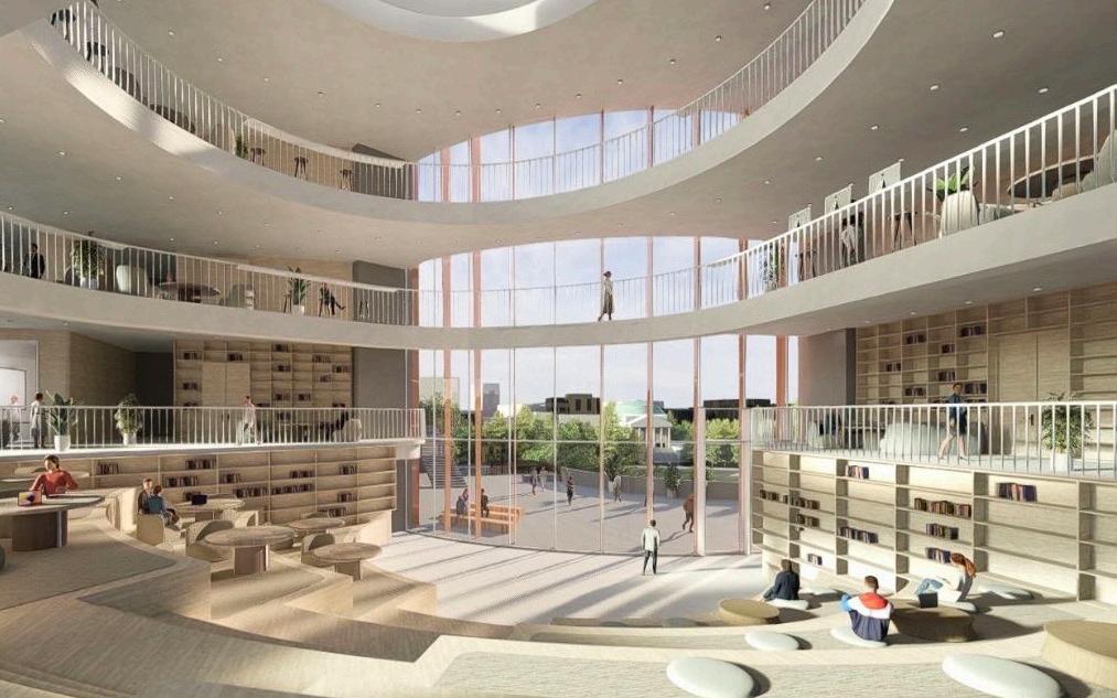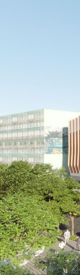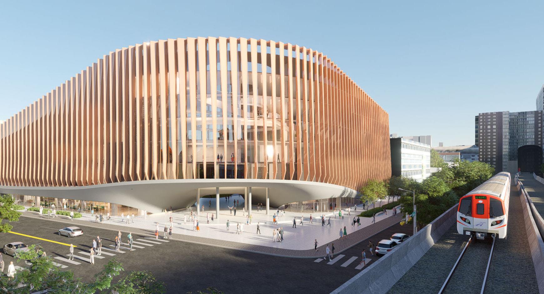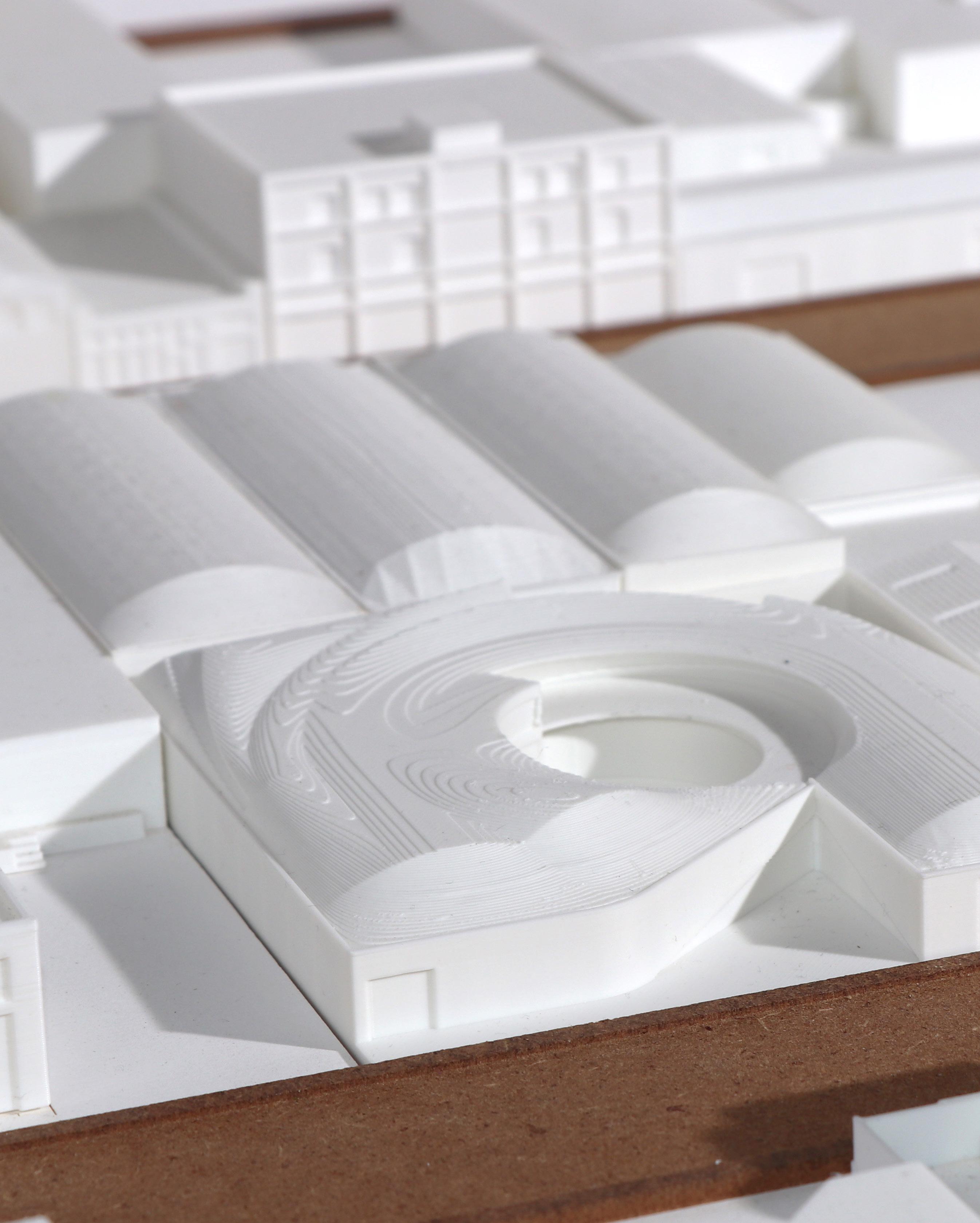 The elevations echo this rhythm through varied extrusions and a stepped roofline that integrates seamlessly with the urban fabric. Composite stone materials and green roofs blend the project into the natural backdrop while establishing it as an iconic landmark.