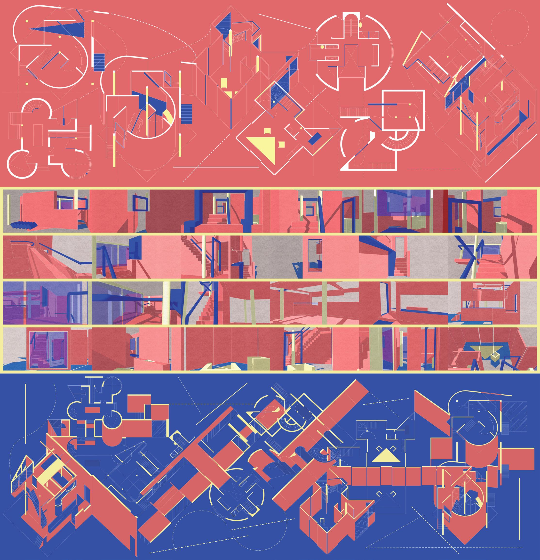 The organizational strategy emphasizes duality and circulation, alternating between centripetal spaces—quiet areas such as bedrooms and central courtyards—and centrifugal spaces that invite social encounters. Each edge functions as a hinge, capable of either separating or connecting spaces.
