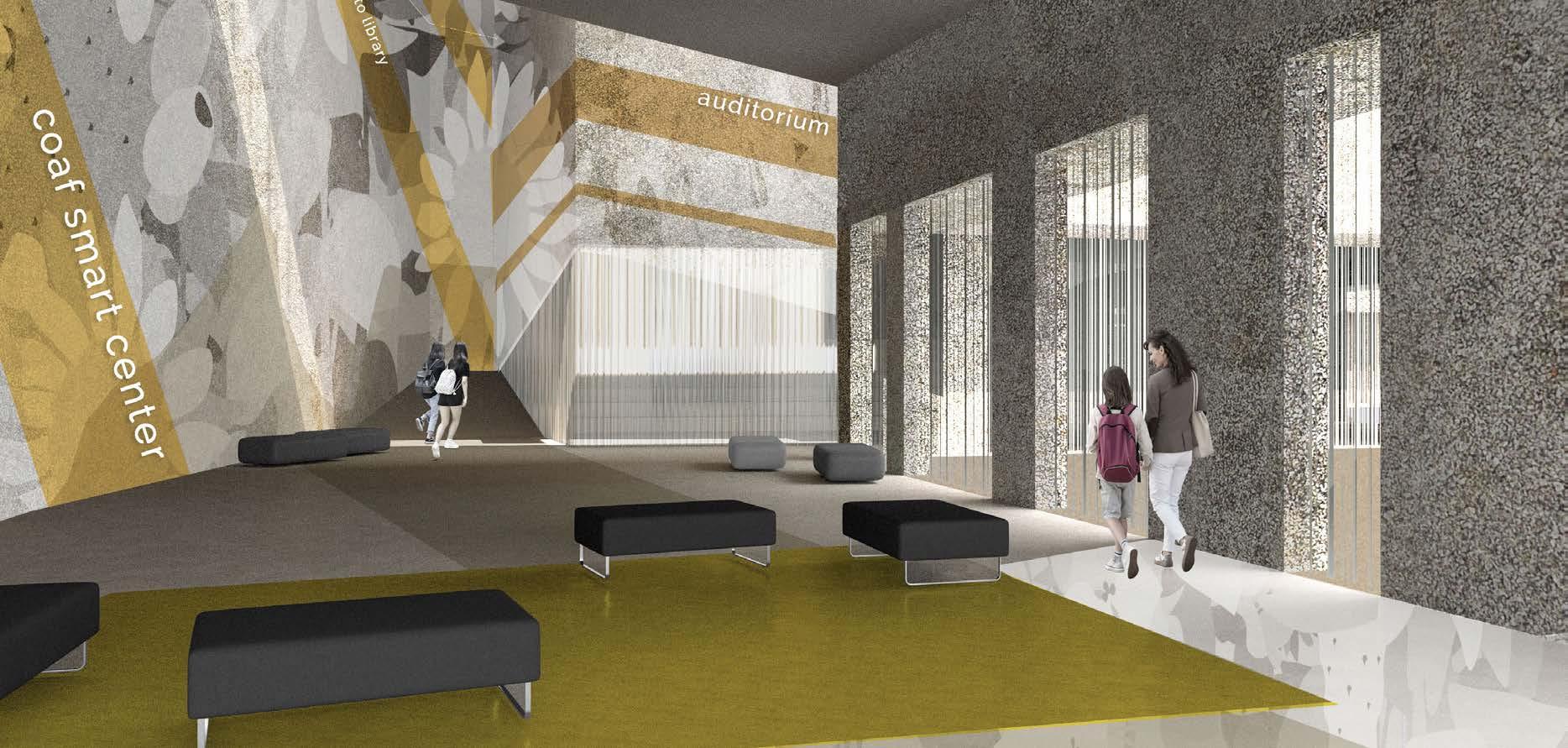 Inspired by local geological features, the facade employs GFRC panels and glazing in alternating patterns. Speckled textures and mirrored fritting amplify reflections, creating an abstract narrative that shifts with the seasons. The COAF Goris Smart Center offers a sensorial experience that fosters curiosity and exploration, ensuring its lasting relevance within the community.